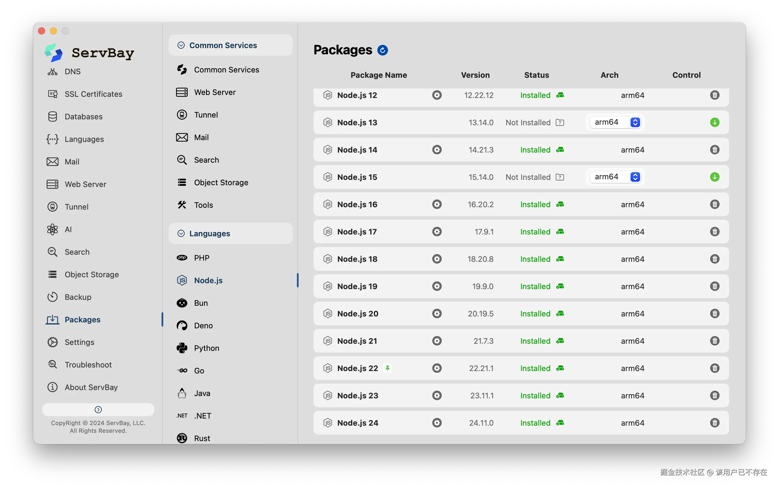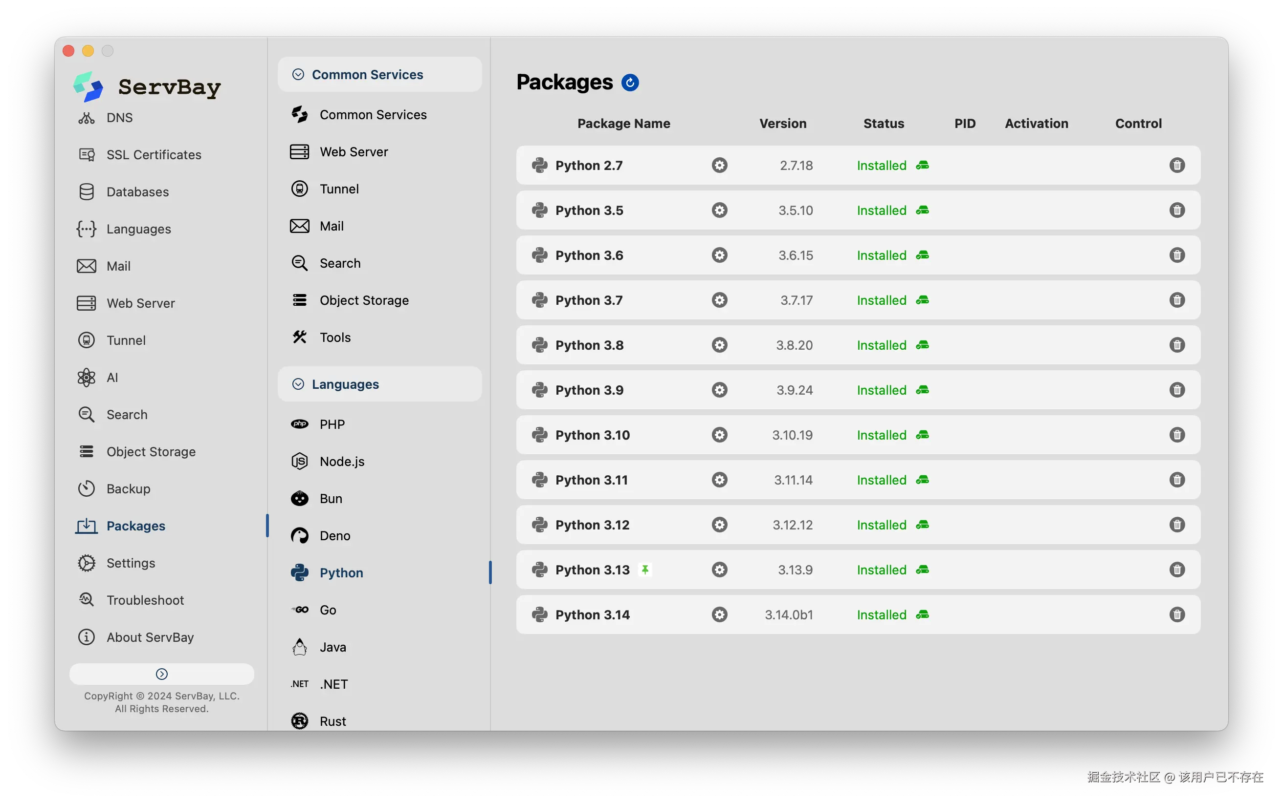- 多语言环境一键就绪:ServBay 内置了多个版本的 Node.js、Python 和 PHP、Rust、Go等。不需要手动去搞