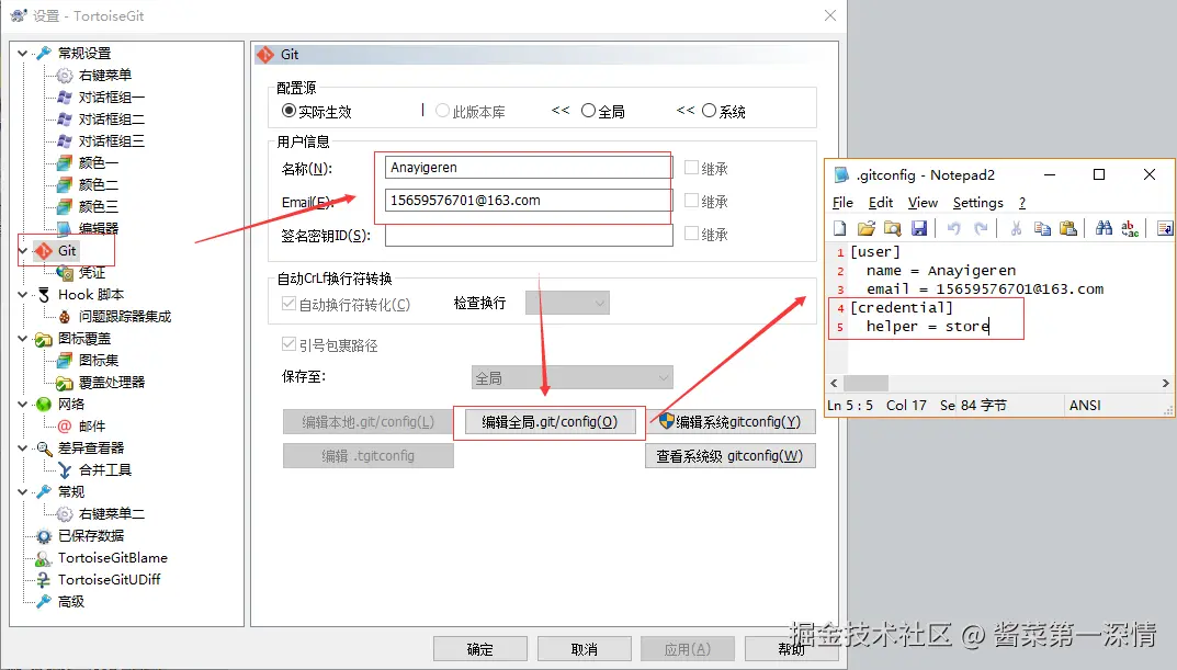 点击 “编辑全局 .git/config(O)”按钮,会使用记事本打开全局配置文件,在全局配置文件中,在后面加上下面的内容(记住密码):