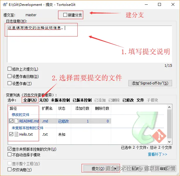 ****在弹出提交(Commit)对话框中完成提交说明信息,和选择需要提交的文件,可根据需要新建分支,然后点击 【提交】 按钮,将修改提交到本地仓库: