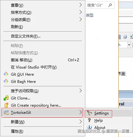 第2步: 在空白处点击鼠标右键,选择 --> TortoiseGit --> Settings,然后就可以看到配置界面: