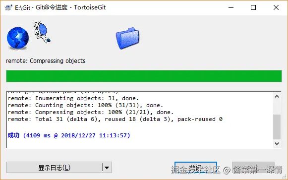 然后弹出推送进度界面,可能要求你输入用户名,点击【确定】,然后要求输入密码,密码输入正确后,显示推送成功界面: