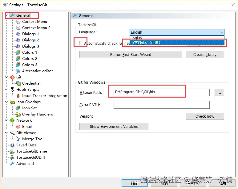 第3步: 选中General,在右边的 Language中选择简体中文(当然,你也可以继续使用英文)。取消勾选升级检查的复选框,可能还需要指定 git.exe 文件的路径,如 "D:\Program Files\Git\bin"。完成后,点击应用,确定关闭对话框。