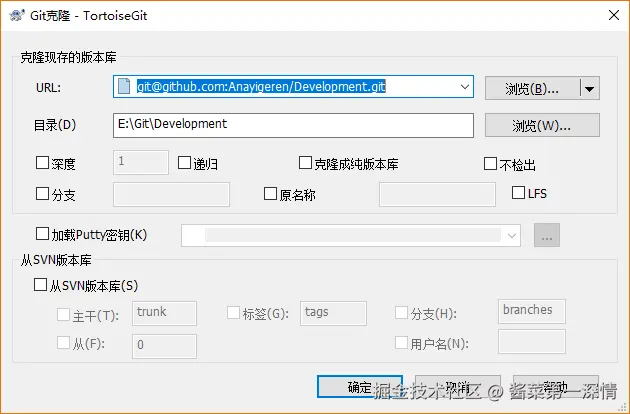 如果你按照上一小节Tortoisegit 配置的设置操作,则输入密码以后会记住密码。密码会明文保存在C:\Users\用户名.git-credentials 这个文件中,请小心保存。