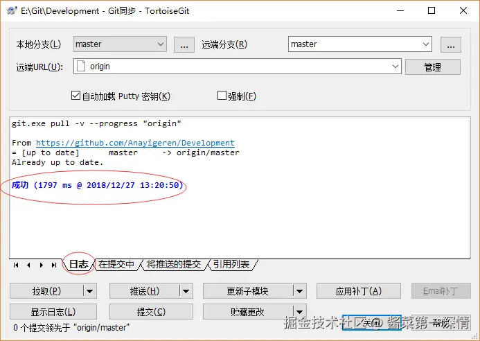 如果服务器上的文件没有被修改过,就会直接提示已经更新到最新,那你就可以直接进行下一步“推送(H)”操作了: