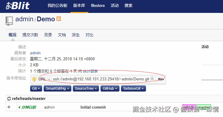 Gitblit 仓库: 在存储库页面这个位置得到存储库的 giturl 路径: