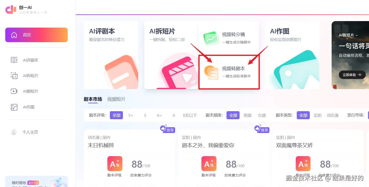 第二步:登录创一 AI,进入视频转剧本功能