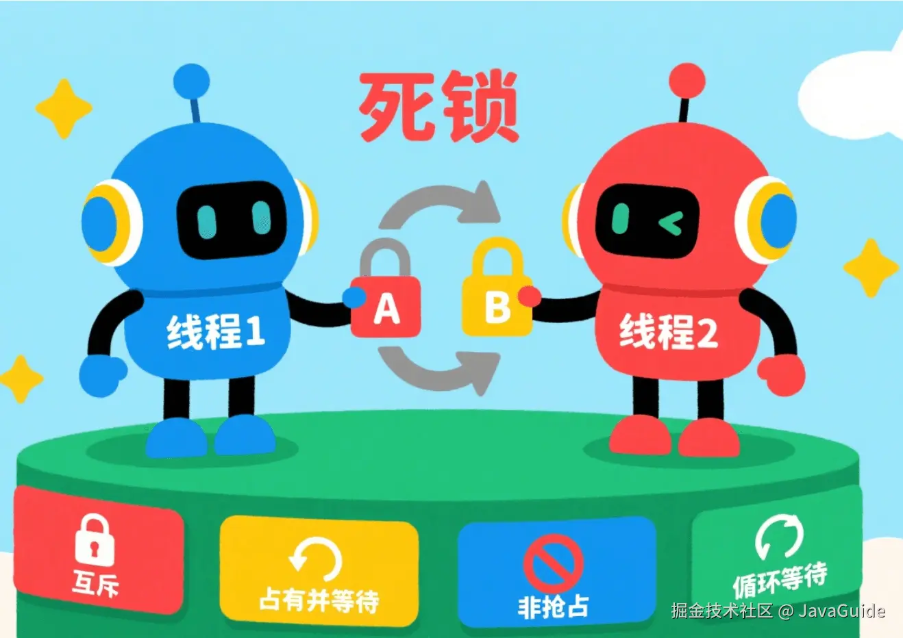 注意 ⚠️:这四个条件是产生死锁的 必要条件 ,也就是说只要系统发生死锁,这些条件必然成立,而只要上述条件之一不满足,就不会发生死锁。