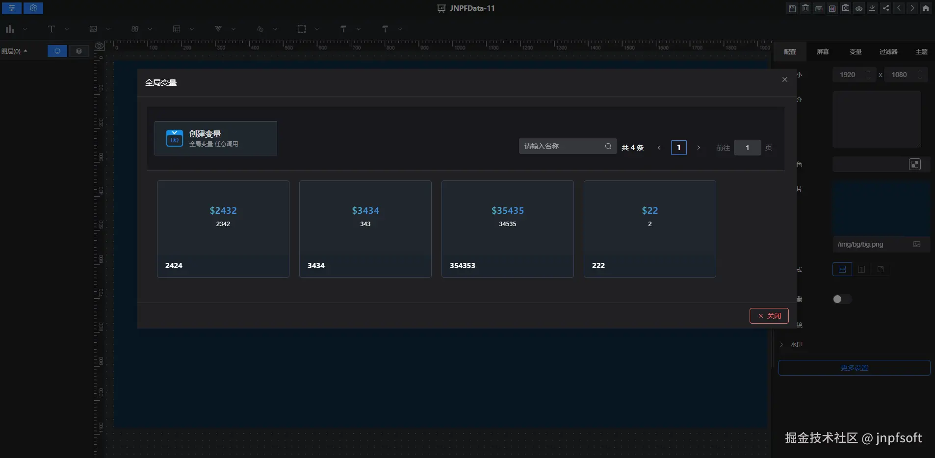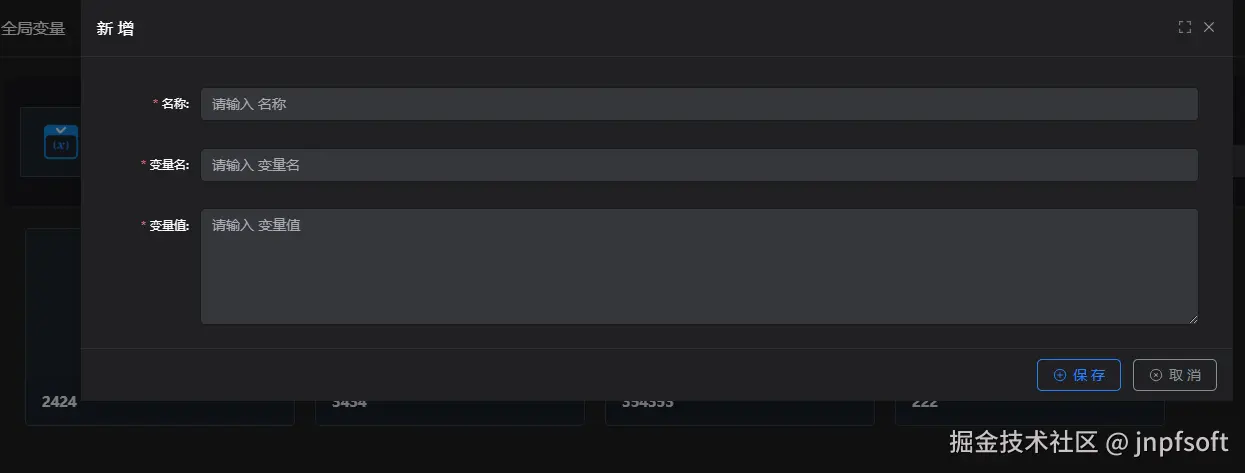 也可在大屏设计中,新建全局变量点击创建变量,展示变量新增数据框,名称、变量名、变量值为必填项,点击保存,变量新建成功,点击取消,取消变量的新建