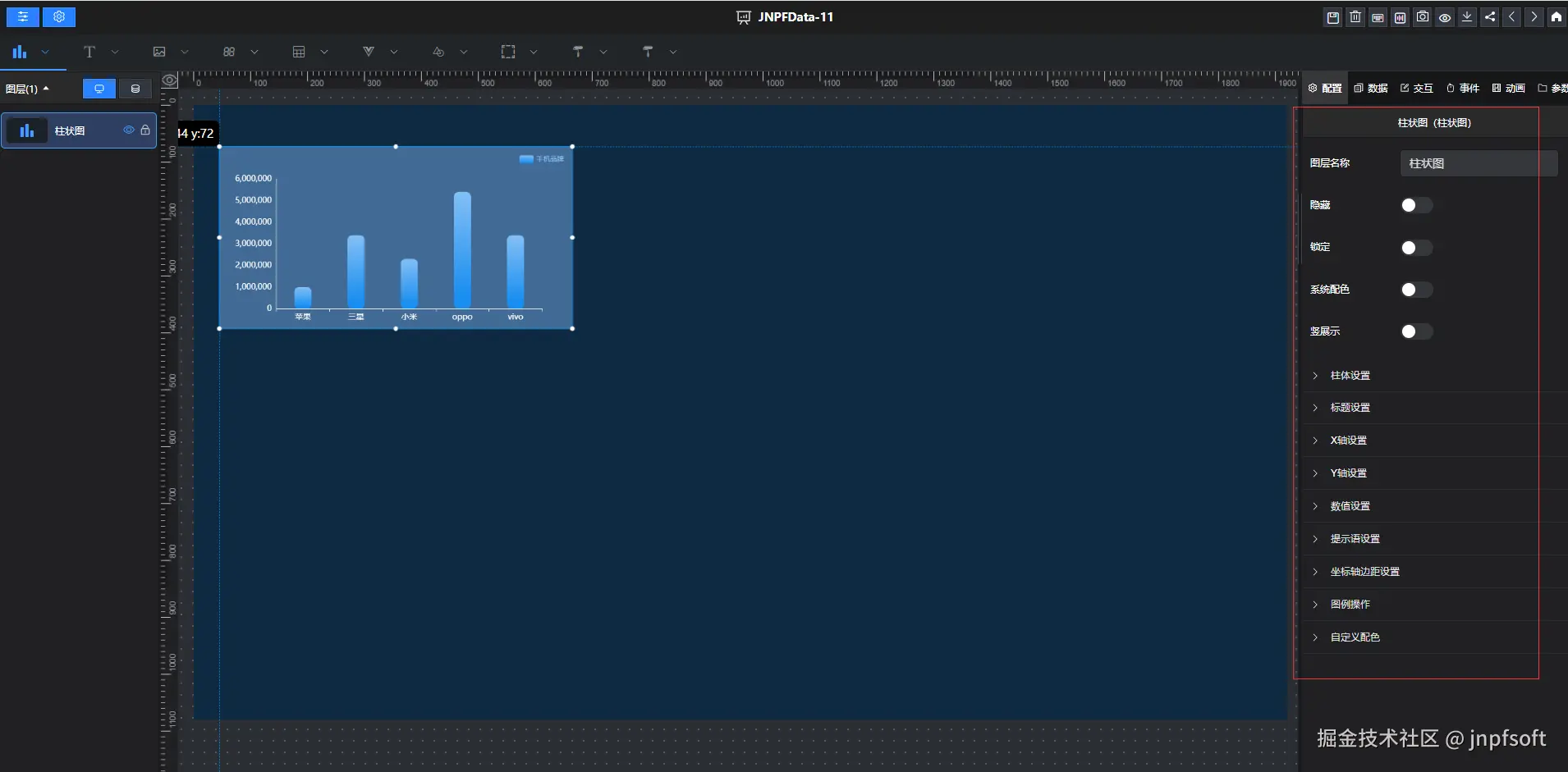 点击控件,即可展示在大屏设计页面上,可自由拖动,点击控件,右侧对应控件配置栏,可对控件进行单独配置