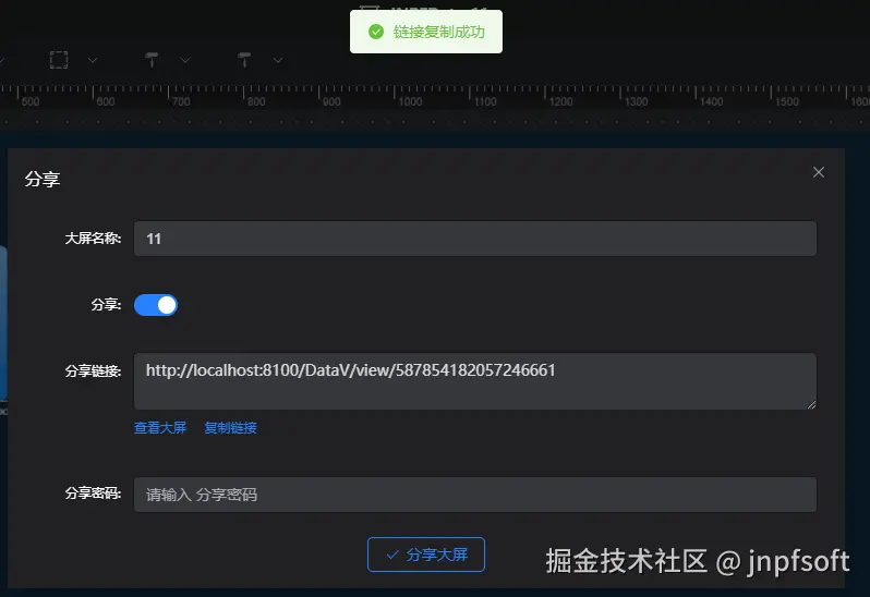 点击复制链接,提示复制成功,可通过复制的链接查看大屏