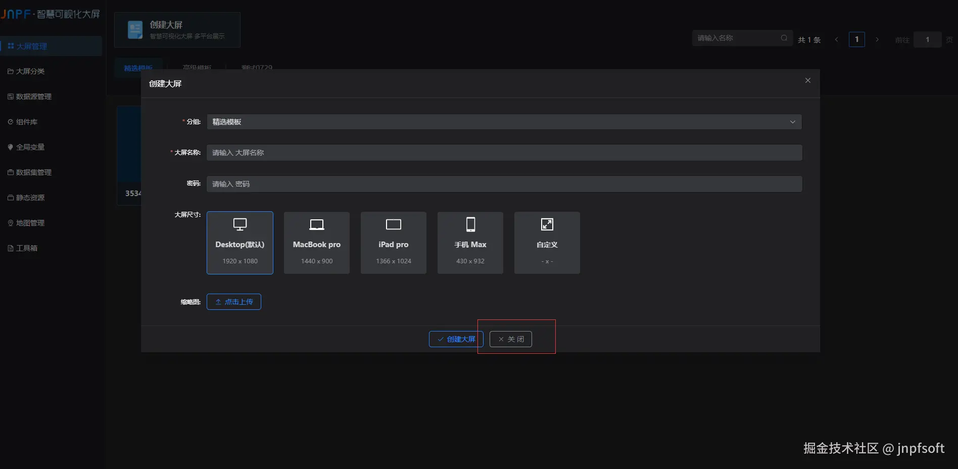 点击关闭按钮,取消大屏的创建,页面回到大屏管理