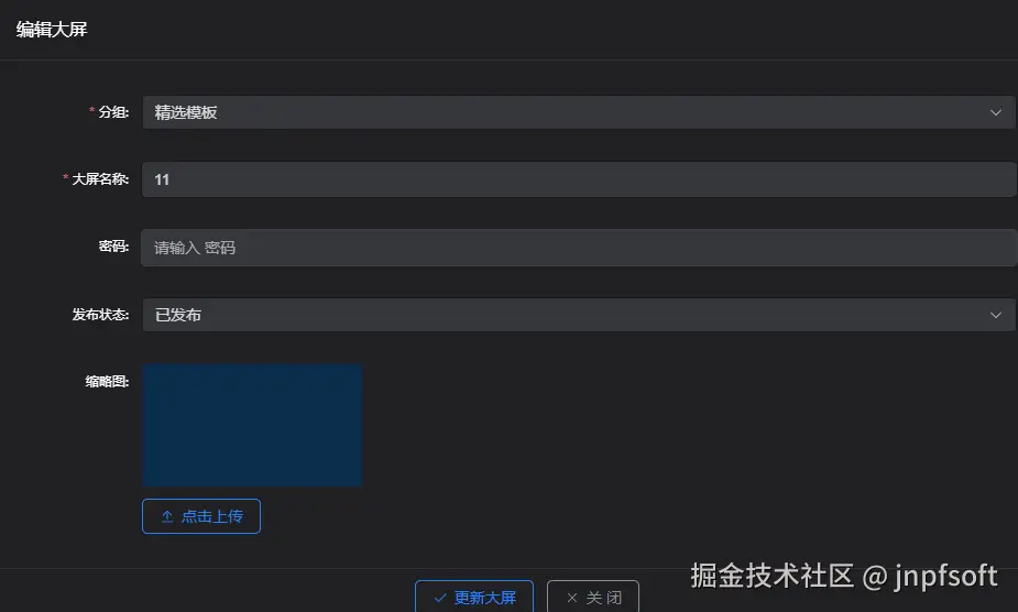- 点击新建大屏,展示信息填写内容页面,分组、大屏名称为必填项,大屏尺寸默认为desktop,可上传缩略图