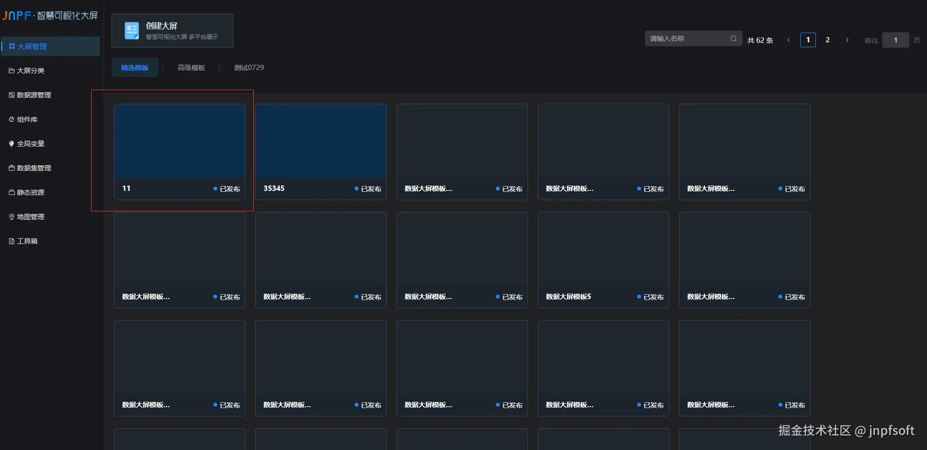 进入大屏管理页面,展示分类下的大屏