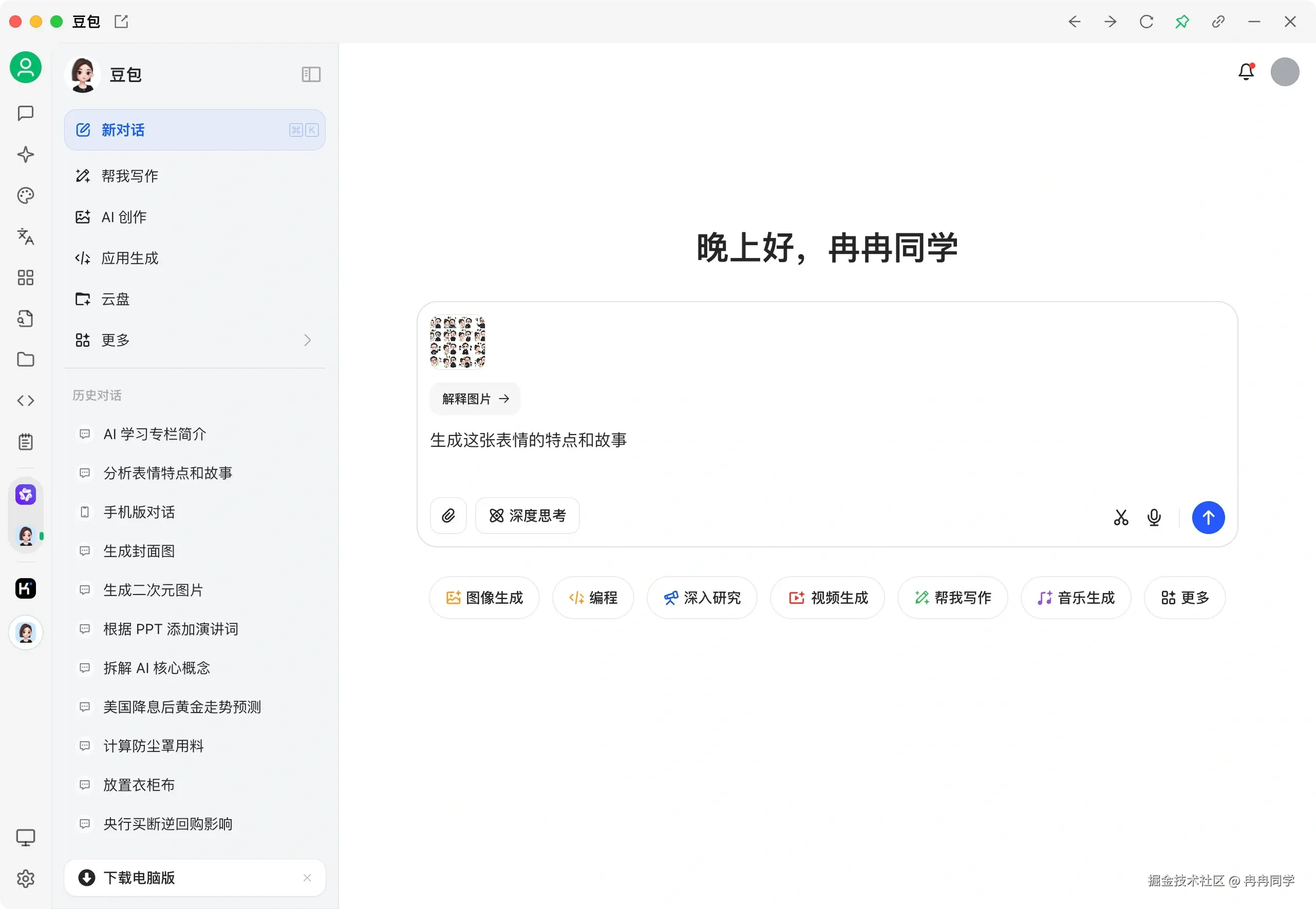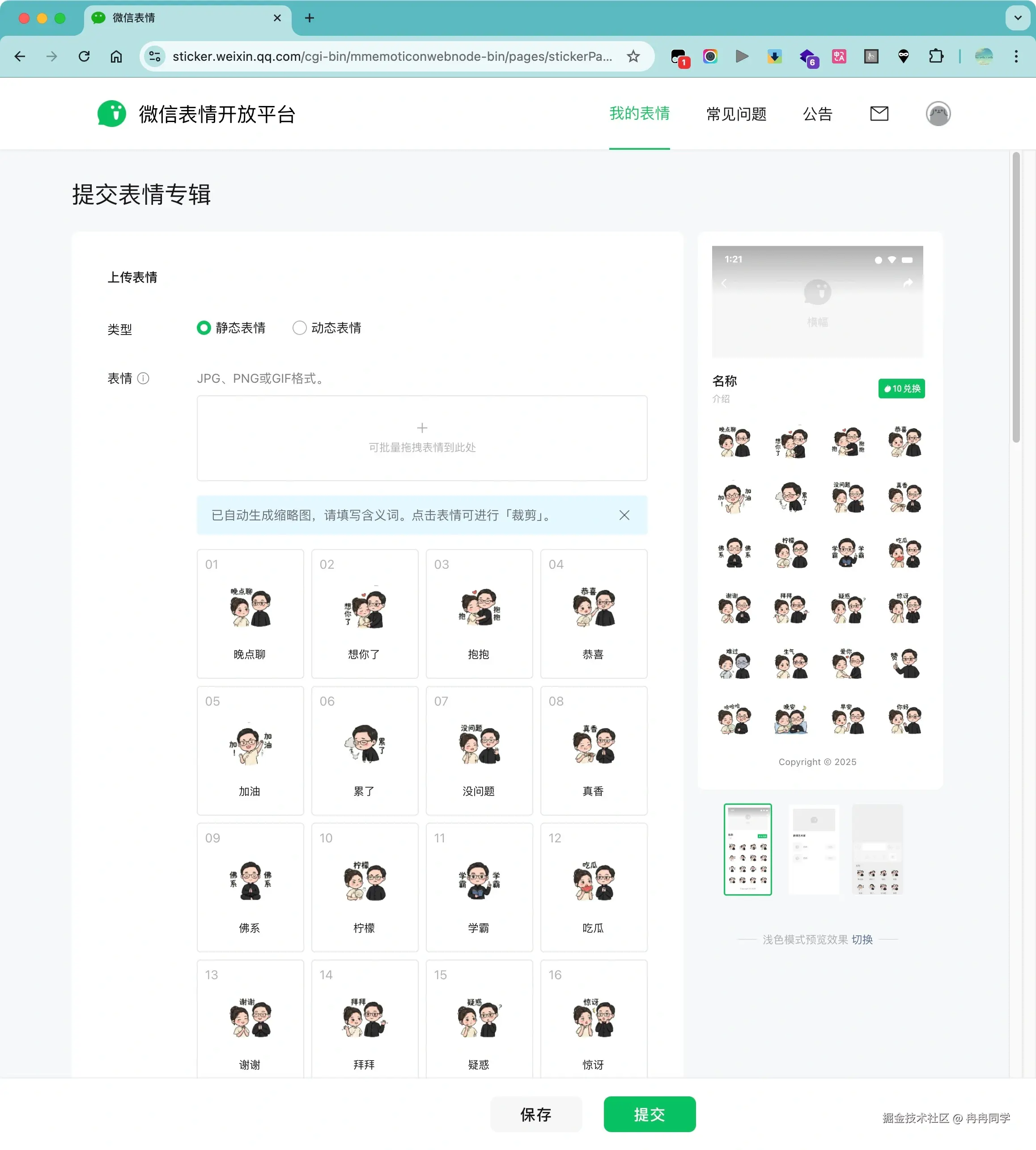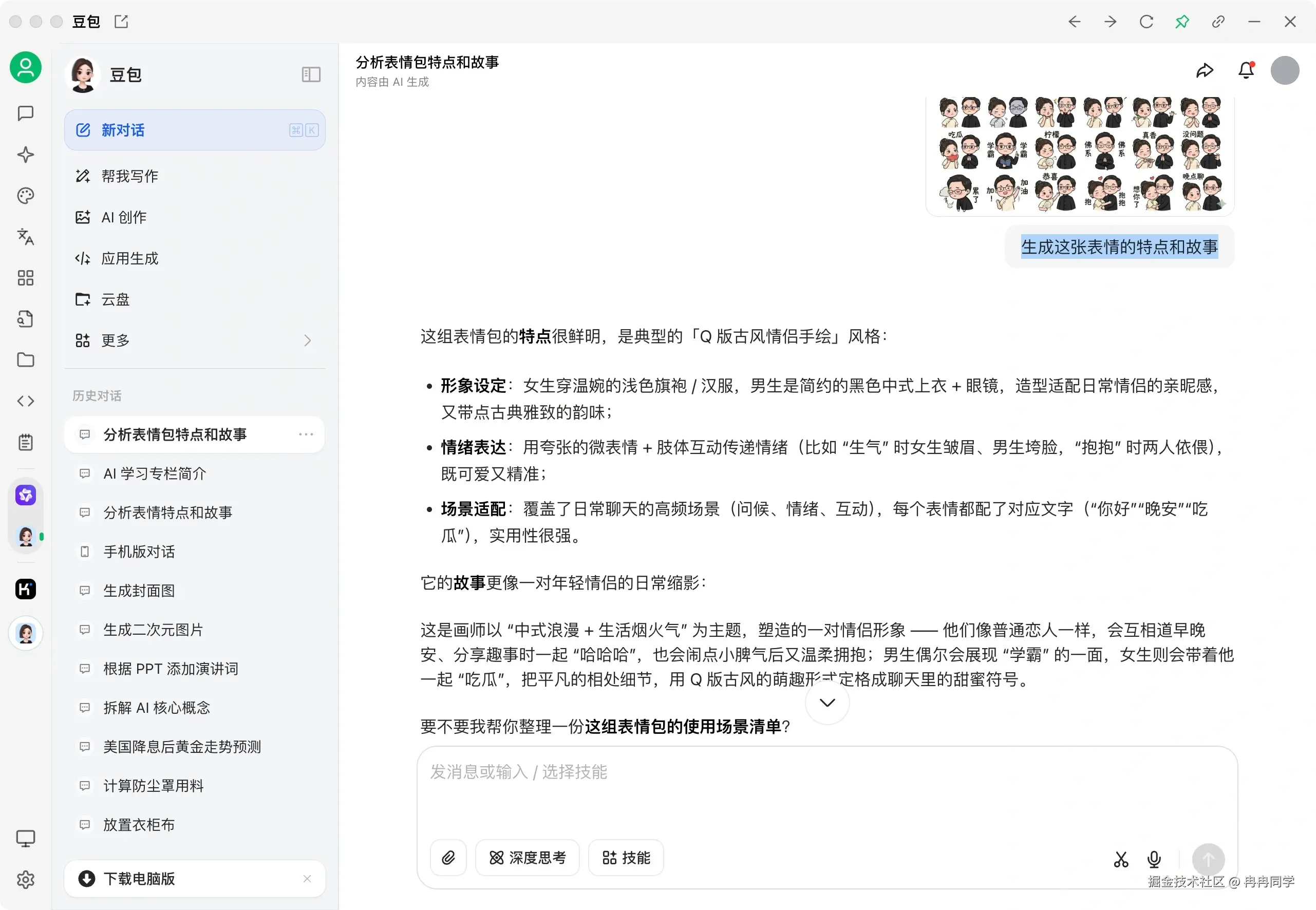 - 填写基本信息 名称:这个起一个你喜欢的名称 介绍:可以用 AI 生成,例如我这里用的是豆包,选择步骤一生成的表情包集合,然后输入下面的提示语