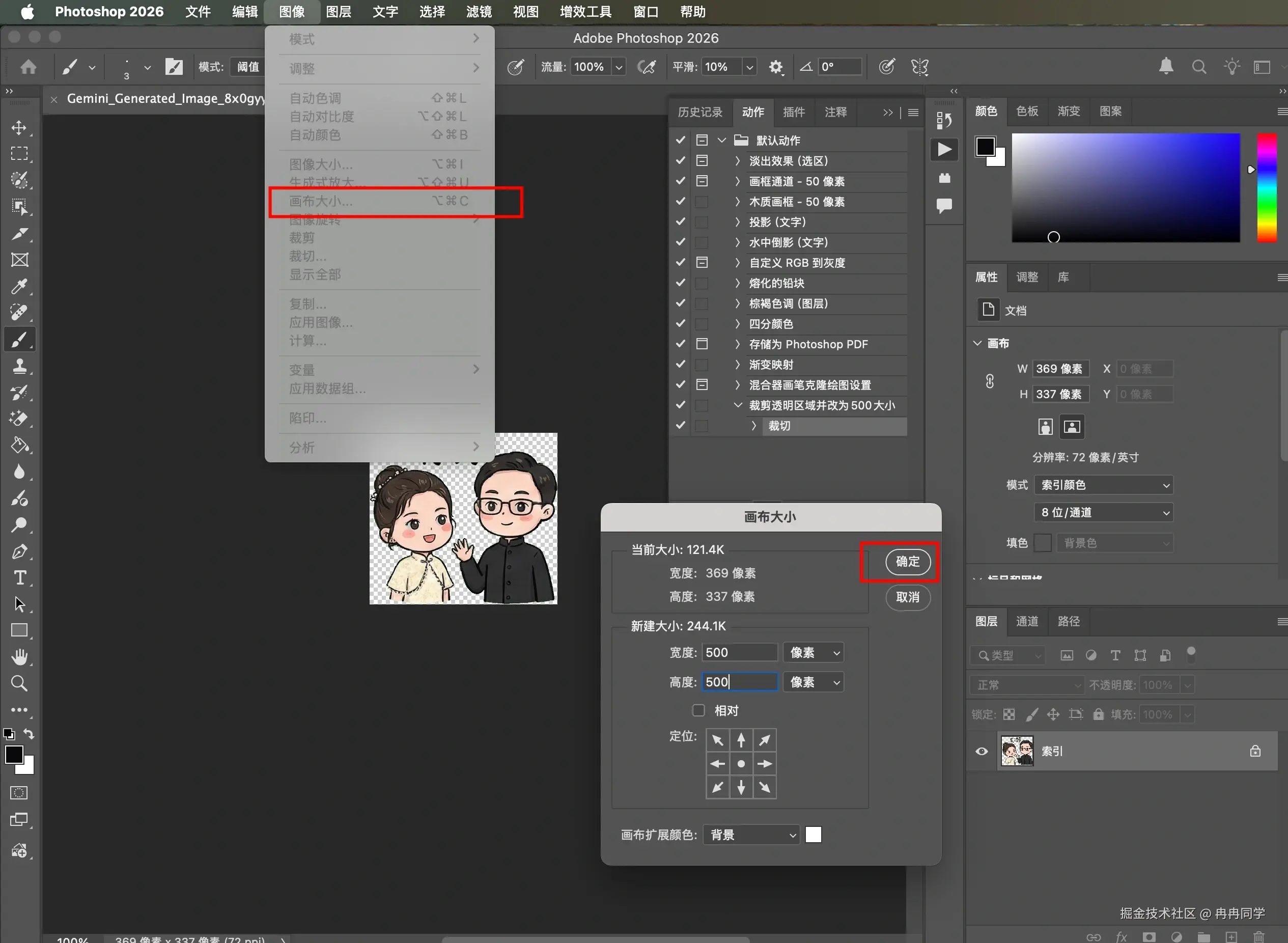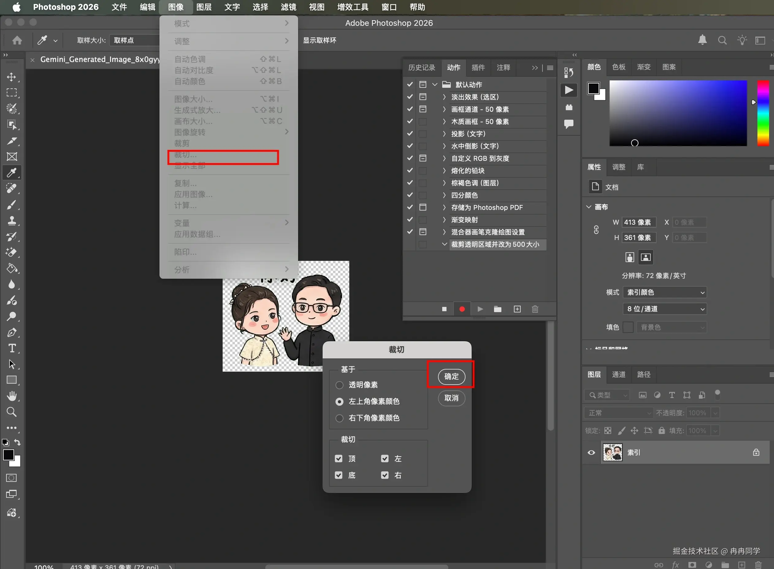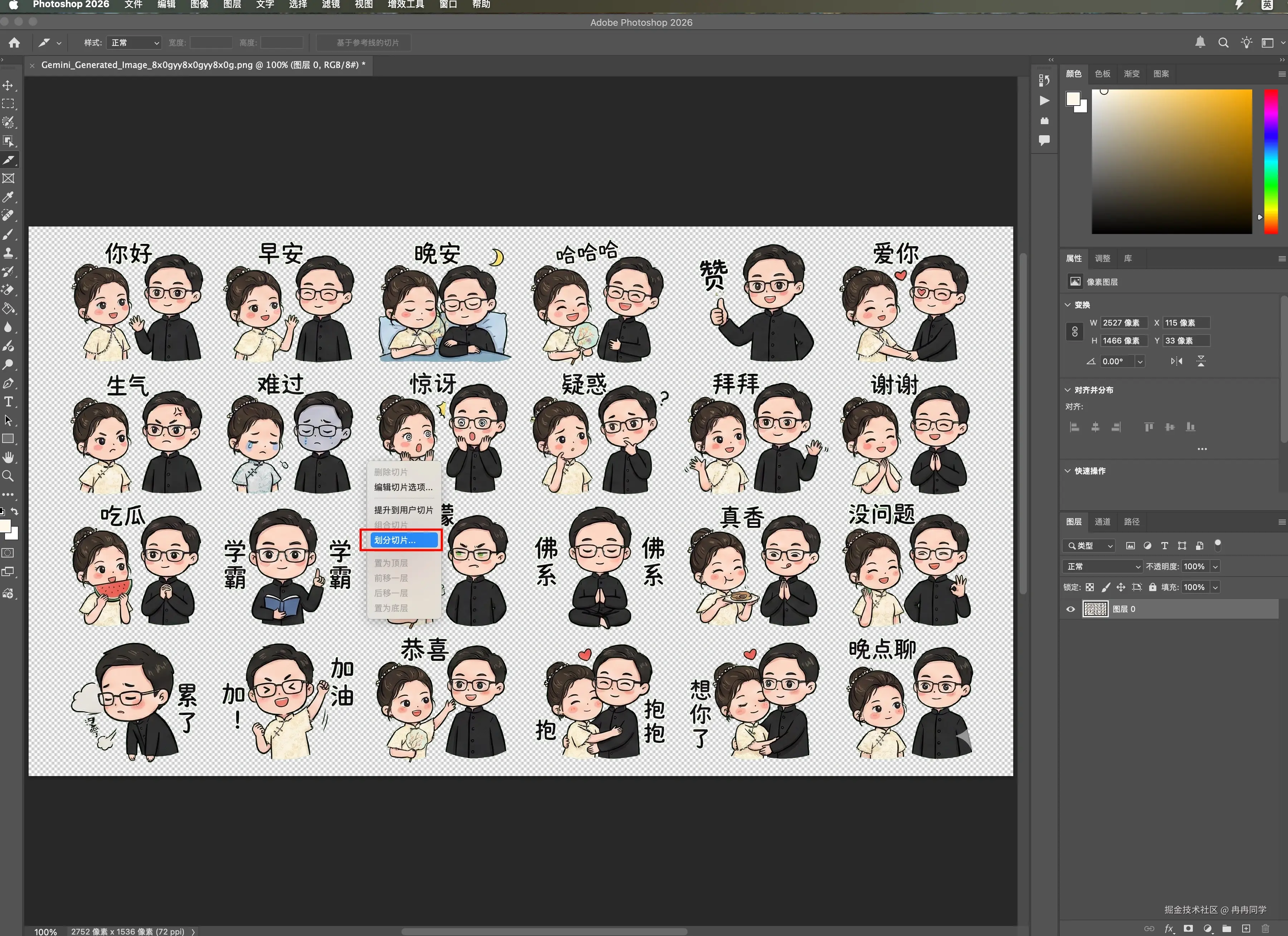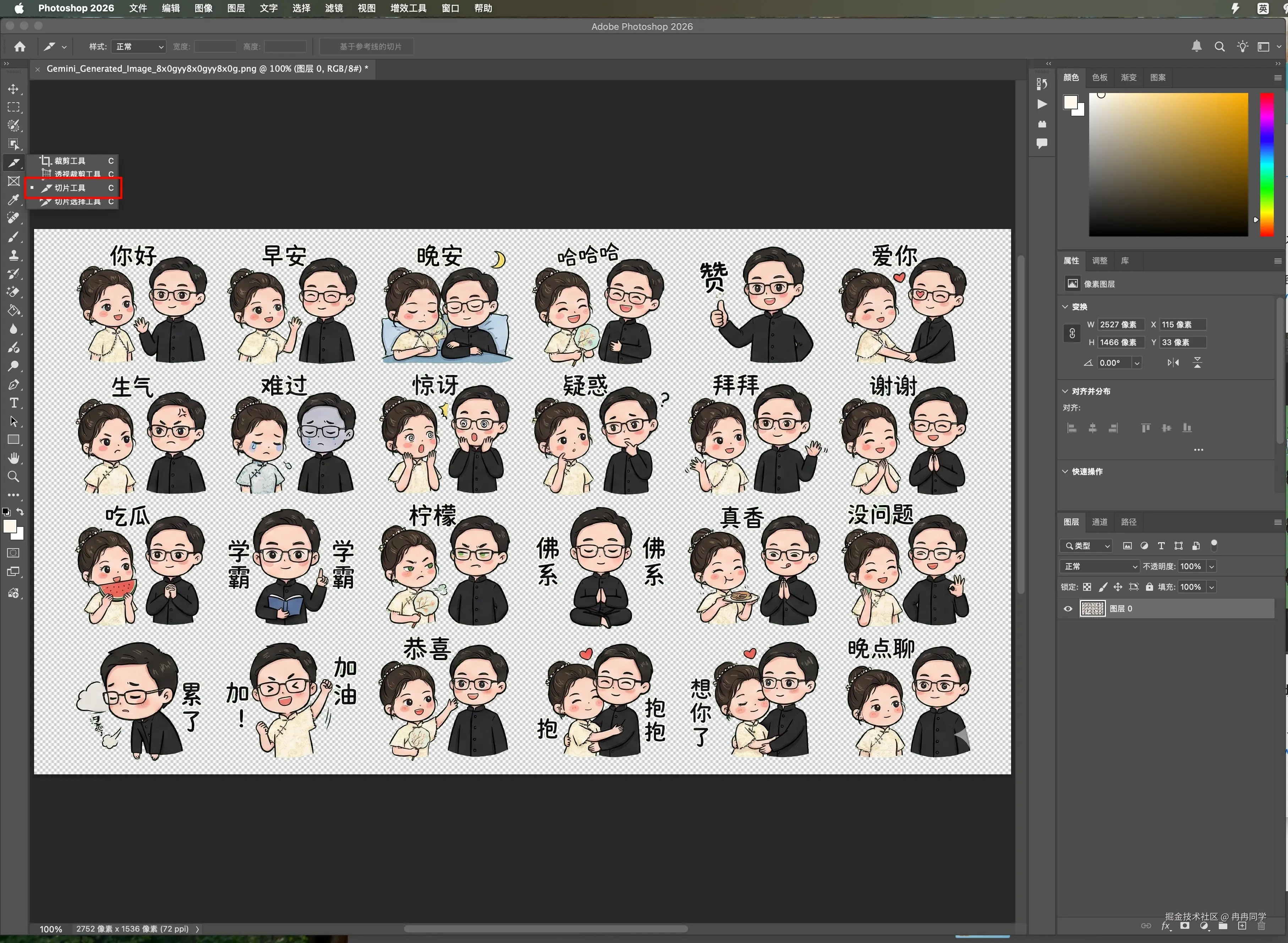 切片后我们会发现图片的宽高可能不一样,此时我们需要用 Photoshop 裁切所有的透明区域,然后更改所有图片的画布大小,即可完成表情包图片的宽高一致性。