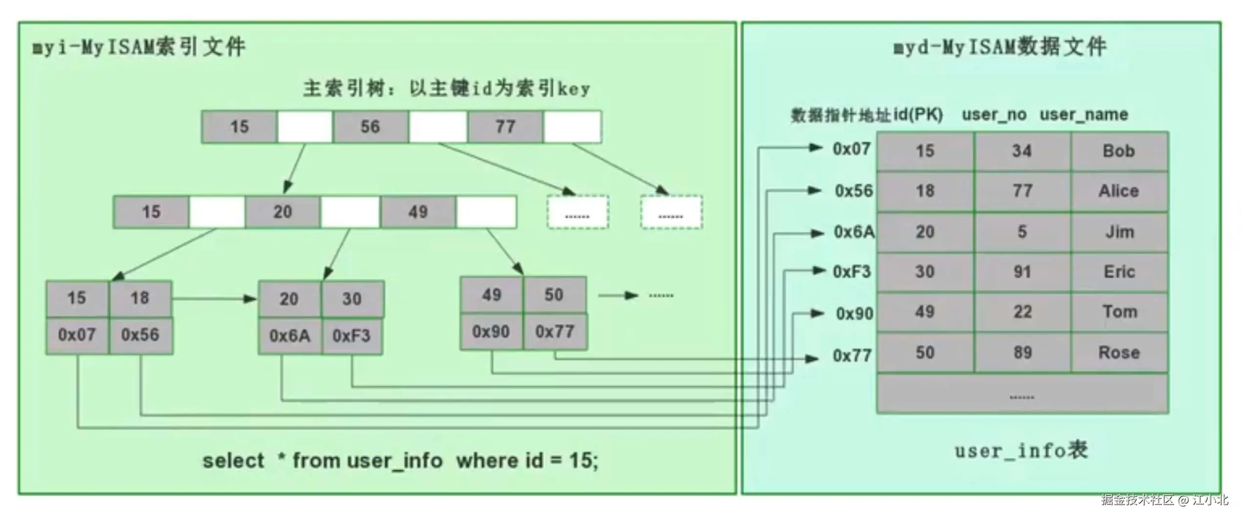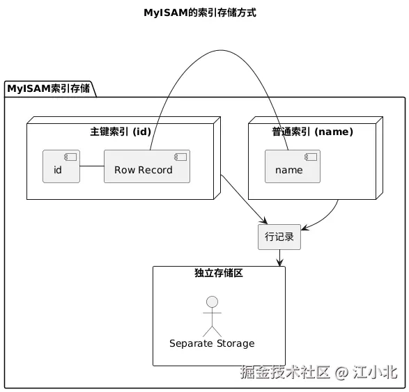 MyISAM的索引存储方式有点特别,它把索引和行记录分开存储,这种方式被称为非聚集索引(UnClustered Index)。