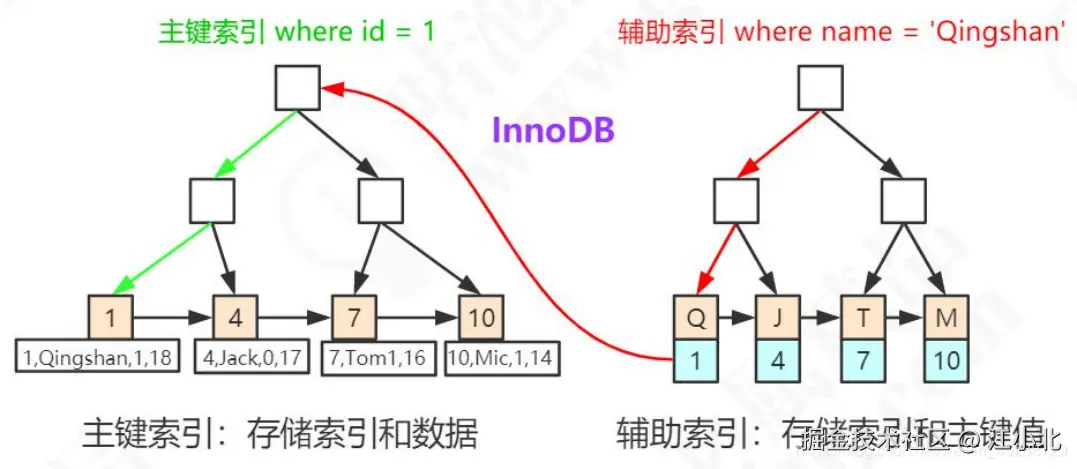 InnoDB的普通索引则不同,它的叶子节点存储的是主键值,而不是指针。