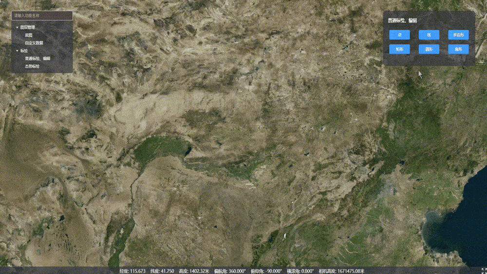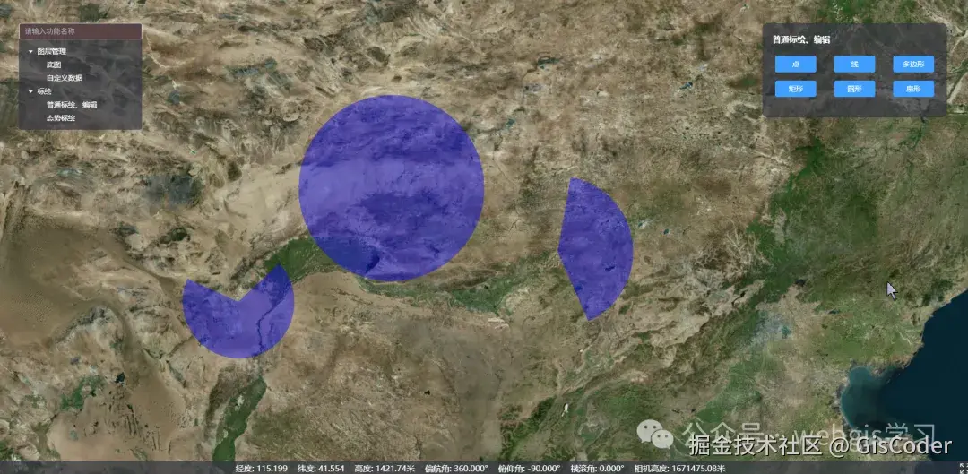 上篇Cesium+Vue3学习教程系列(19)---多边形标绘代码封装修改,新增矩形绘制介绍了矩形的绘制与编辑,为了响应读者的留言增加圆形、扇形的需求,本篇在普通标绘组件中增加圆形、扇形的标绘与编辑。先看效果: