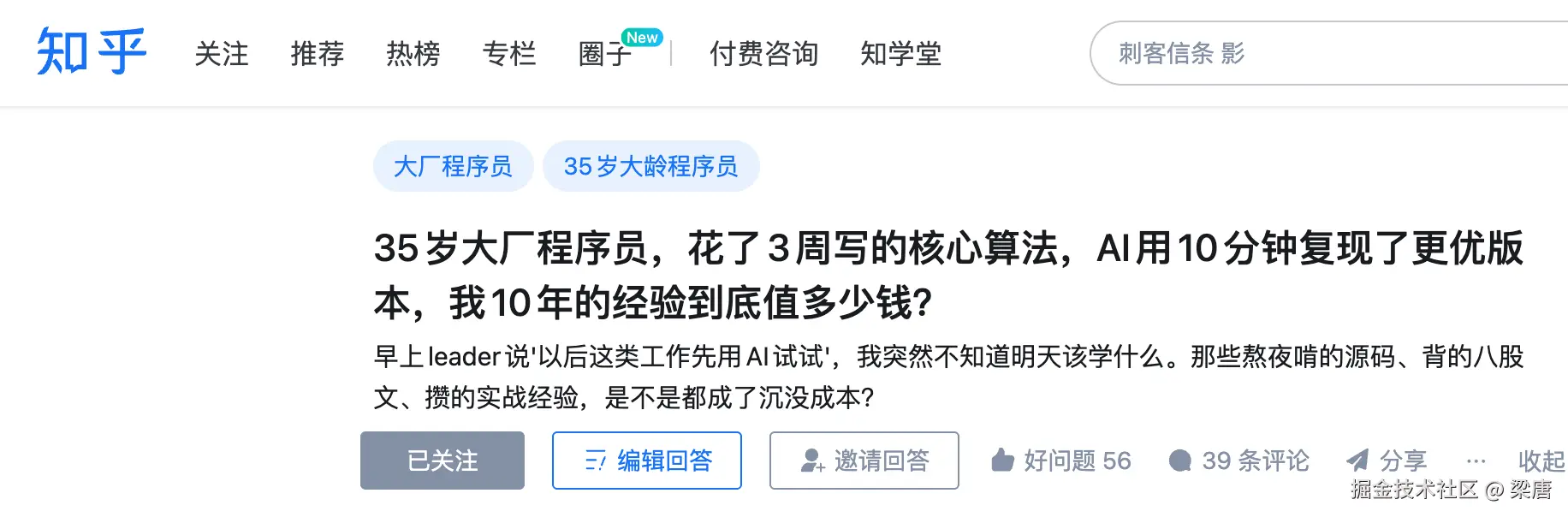 题主说他花了三周时间写的核心算法,被 Ai 10 分钟秒了,感到了非常的焦虑以及自我怀疑。觉得好像之前的十年经验一瞬间变得一文不值。