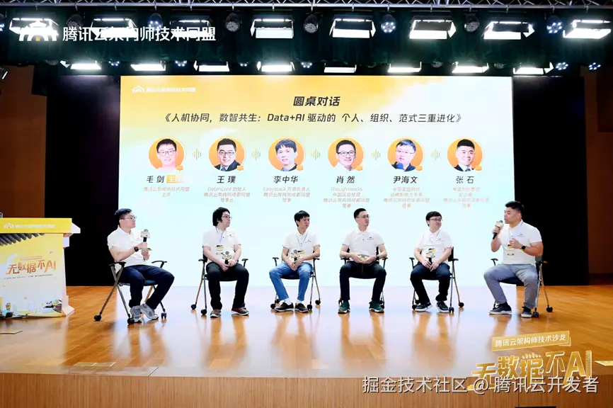 活动最后,来到精彩的圆桌对话环节。在腾讯云架构师技术同盟主席 毛剑的主持下,围绕 “人机协同,数智共生:Data+AI 驱动的个人、组织、范式三重进化” 主题,DatenLord 创始人、腾讯云架构师成都同盟理事长 王璞,Easystack 开源负责人、腾讯云架构师成都同盟理事 李中华,Thoughtworks 中国区总经理、腾讯云架构师成都同盟理事 肖然,中亦安图科技品牌影响力专家、腾讯云架构师成都同盟理事 尹海文,禅道软件集团副总裁、腾讯云架构师成都同盟理事 张石,多角度探讨 AI 时代下开发者能力、组织形态、技术范式的协同进化,真诚分享自身经历与深刻思考,为与会者带来启发。
