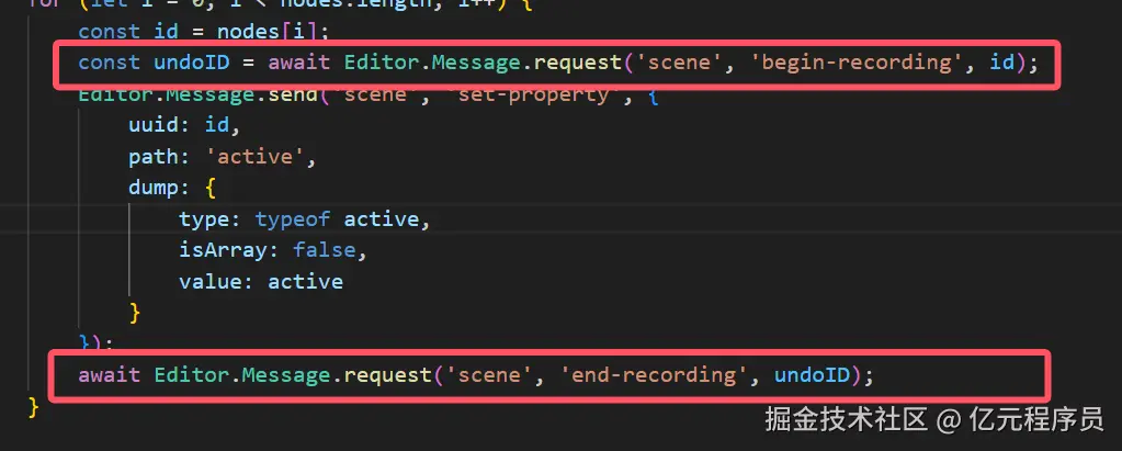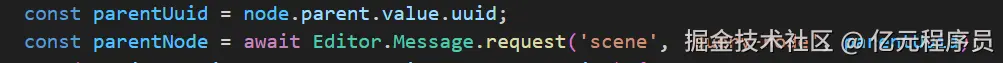 Editor.Message.request('scene', 'query-node', nodes[0])查询节点信息,注意这个不是我们开发时的cc.Node,获取是否隐藏可以通过node.active.value获取。 -