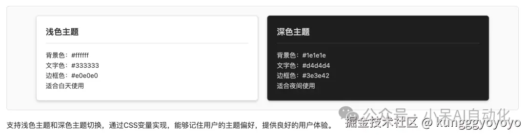 为了提供良好的用户体验,我实现了主题切换功能,支持浅色主题和深色主题。主题切换功能的实现主要包括: