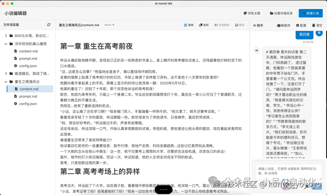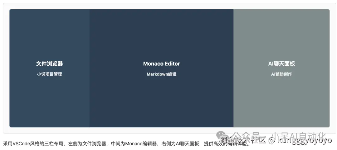 AI小说编辑器采用了VSCode风格的三栏布局,包括左侧文件浏览器、中间编辑器和右侧聊天面板。这种布局设计能够提供高效的编辑体验,让用户可以同时进行文件管理、内容编辑和AI交互。