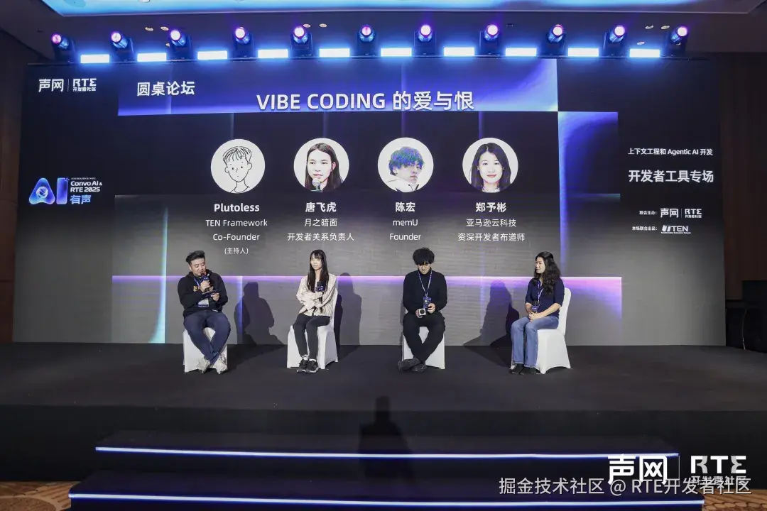 本次主题为「Vibe Coding 的爱与恨」的圆桌讨论由 TEN Framework Co-founder Plutoless 主持,参与讨论的嘉宾有亚马逊云科技资深开发者布道师 郑予彬,memU Founder 陈宏以及月之暗面开发者关系负责人唐飞虎。