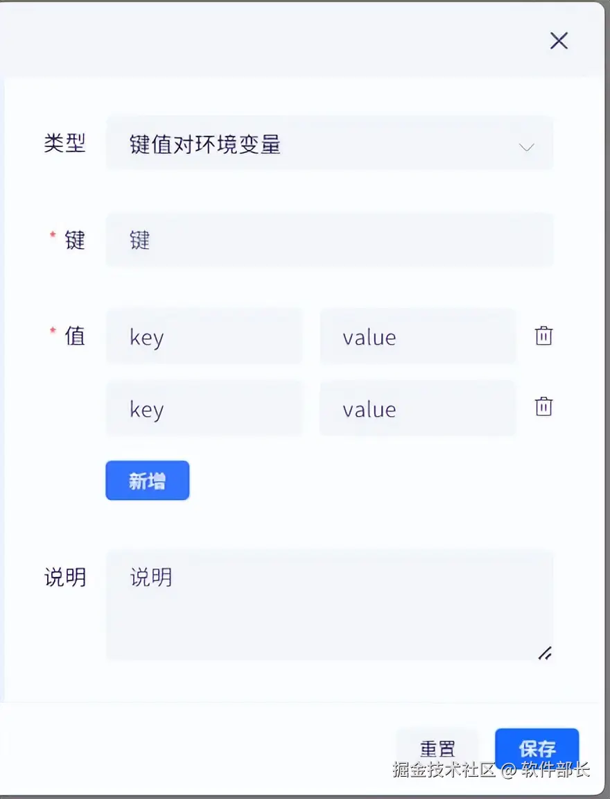 ①:变量类型,有文本(字符串)、文件、键值对(对象)。