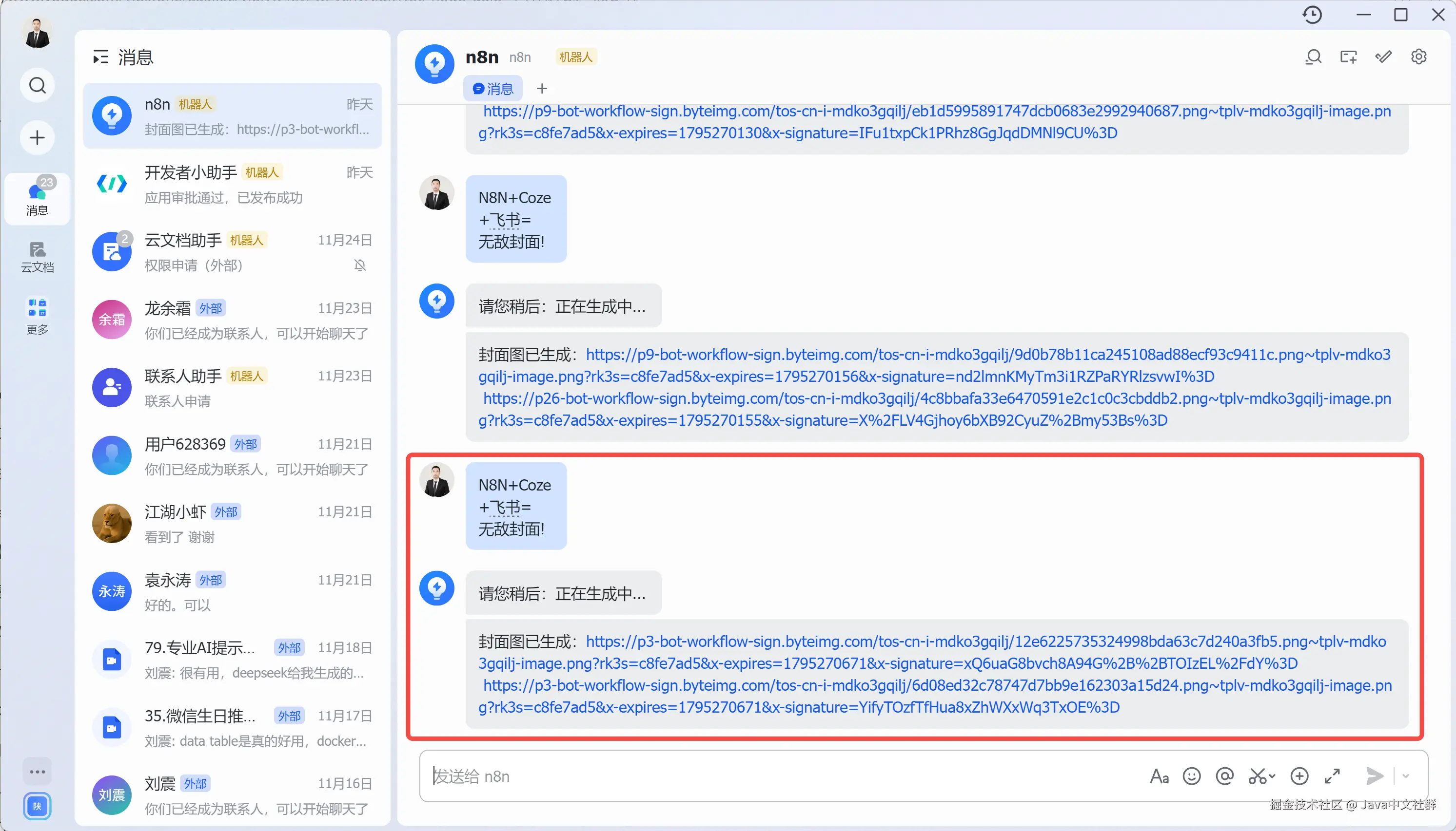 这个系统的使用简直不要太简单!我只需要在飞书里输入想要生成的封面文字,比如"N8N+Coze+飞书=无敌封面",敲个回车,不到 2 秒钟,系统就会自动生成两张高清封面图: