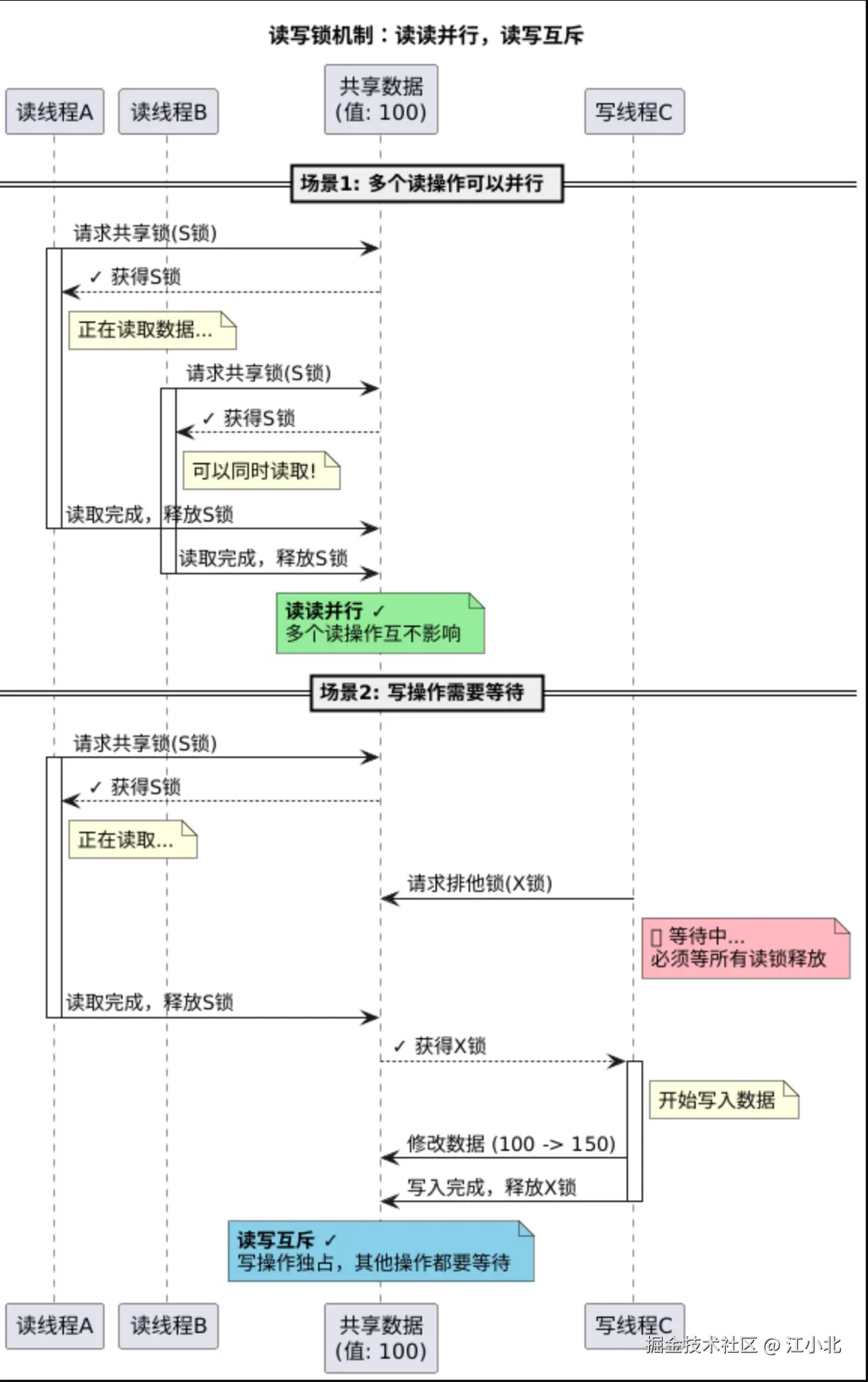 并发能力的演进就这样展开了:普通锁做不到并行 → 读写锁实现读读并行 → 多版本技术实现读写并行。