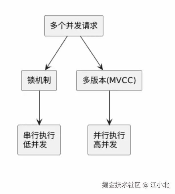 - 并发控制的两个思路是锁和多版本。三个阶段分别是:普通锁(串行)→ 读写锁(读读并行)→ 多版本(读写并行)