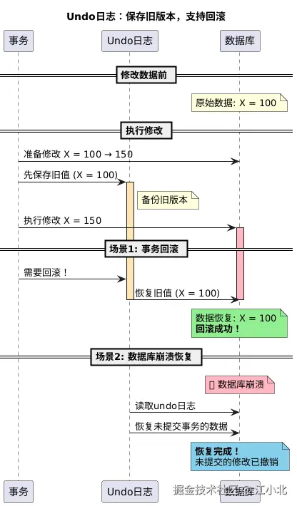undo日志做的事相反。当事务修改数据时,修改前的旧版本被存入undo日志。如果事务需要回滚,或数据库崩溃需要恢复,这些旧版本数据就派上用场了。