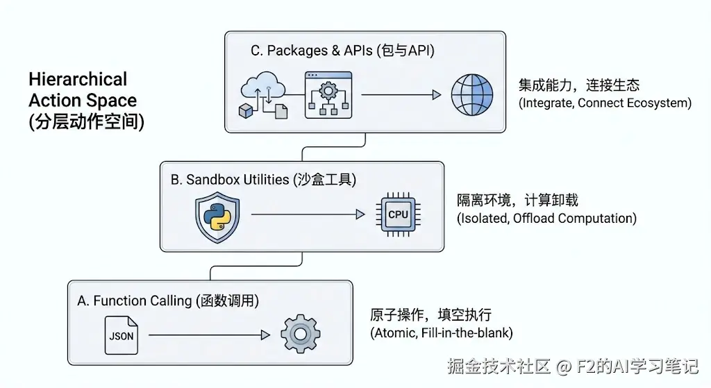 Manus提出了三个抽象层级(Three abstraction levels),这代表了 AI 与外部世界交互的三种不同深度和方式: