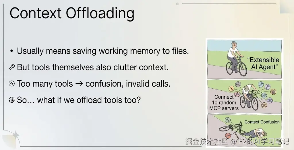 - 如果我们不仅仅卸载记忆,把工具本身也进行卸载(即按需加载工具,而不是一次性全部塞入)会怎样?