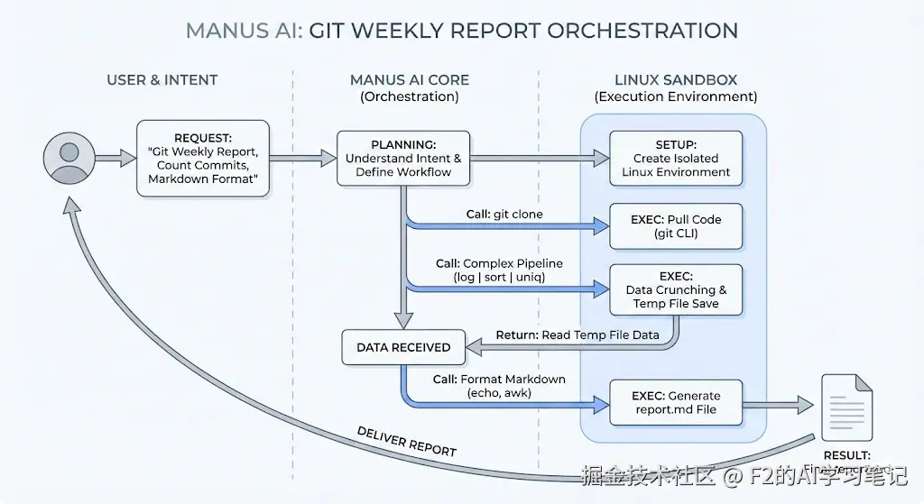 * 作用: 赋予了 Agent 操作系统的能力。它可以使用 `grep` 搜索文件,用 `git` 拉取代码,用 `ffmpeg`处理视频,格式转换器,或者运行 Python 脚本,还有一些特殊的Manus Mcp Cli。这比单纯的文本生成强大得多。