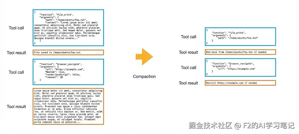 例如,假设某个工具用于写入文件,它可能包含“路径”和“内容”两个字段。一旦该工具执行完成,文件就已经存在于环境中。因此,在紧凑格式中,我们可以安全地删除冗长的“内容”字段,仅保留“路径”。如果智能体设计得当,当它需要再次读取该文件时,可以直接通过路径进行检索。