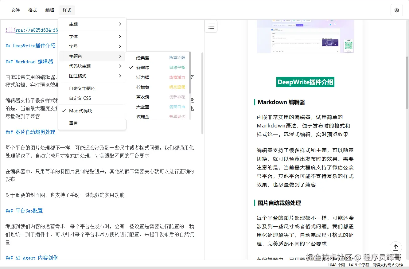 所以经过我的一些调研,做了一款DeepWrite的插件,能够自动处理好内容的格式、图片的问题,并且可以一键切换各种主题样式,然后直接分发到公众号、知乎、头条、掘金等平台
