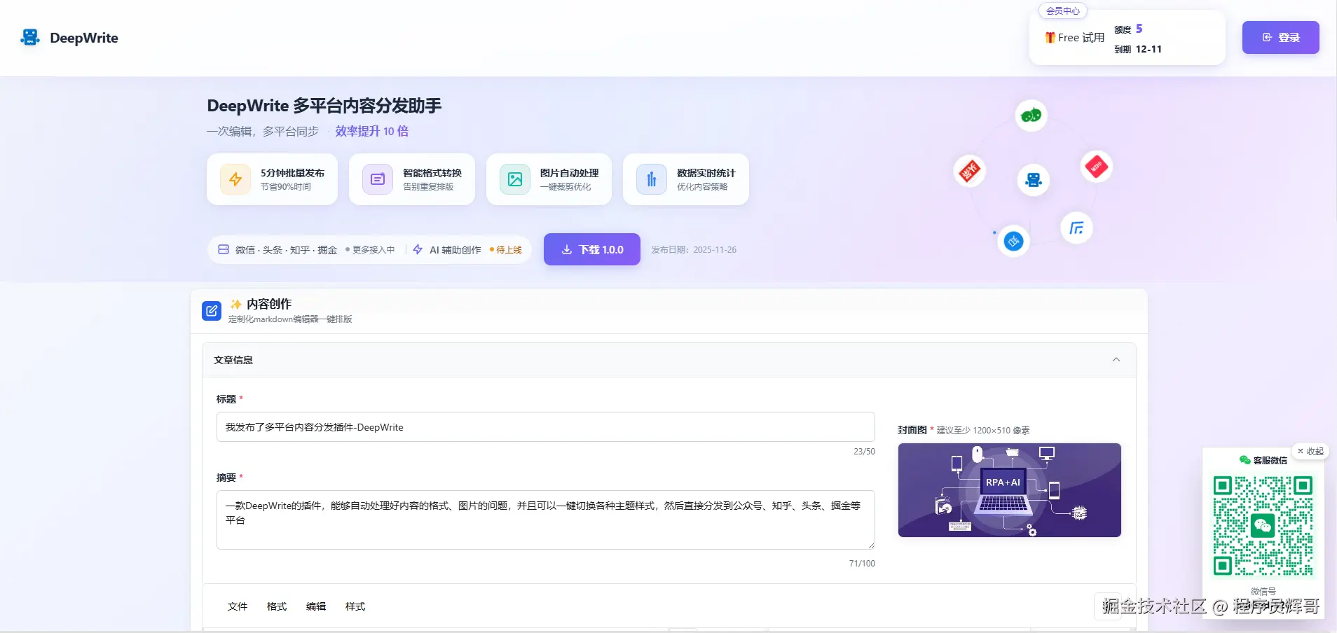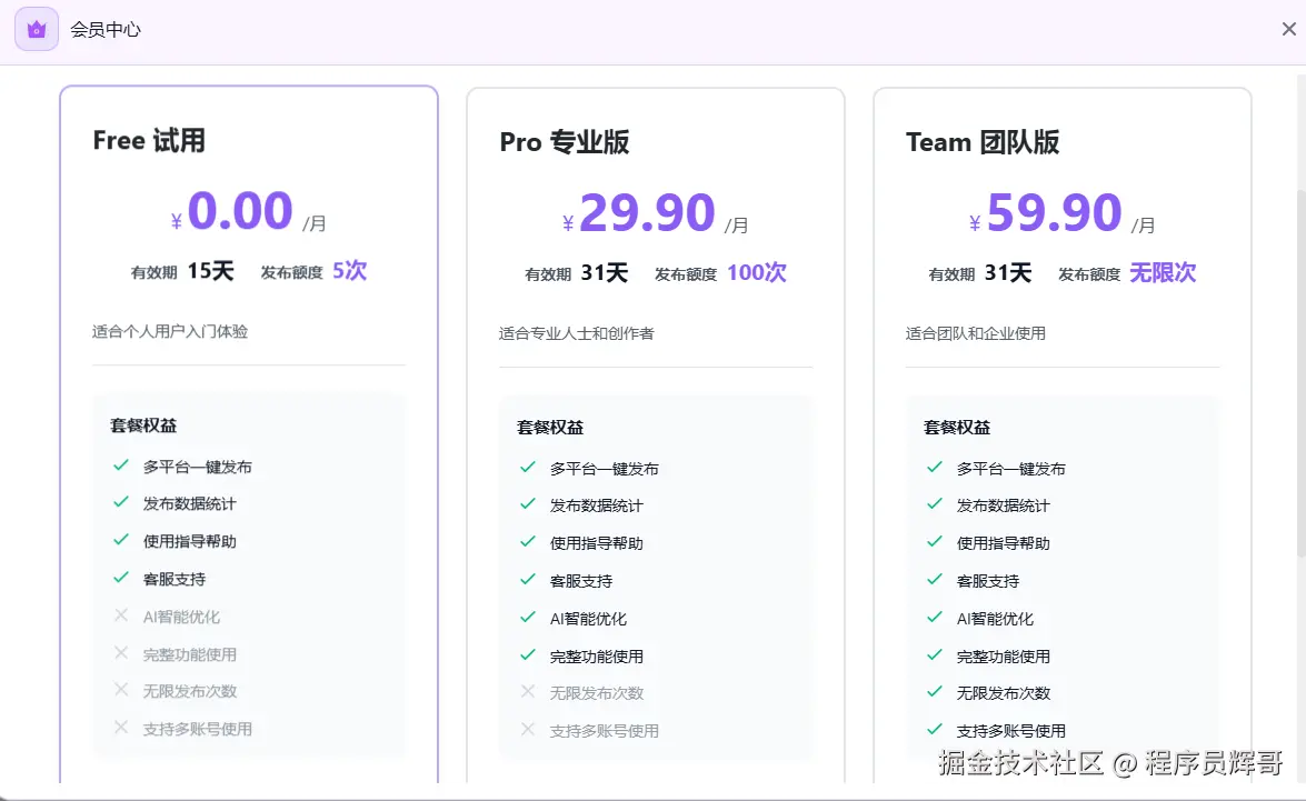 下载插件后,不需要登录,有免费的试用套餐,套餐现阶段针对于发布次数来限制,所有平台发布一次只会消耗一次额度,后续开发AI相关的能力后,会再补充一个AI算力的限制