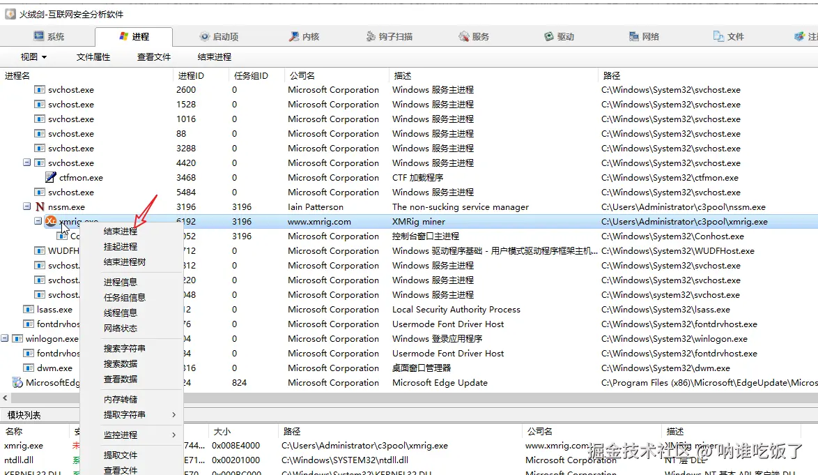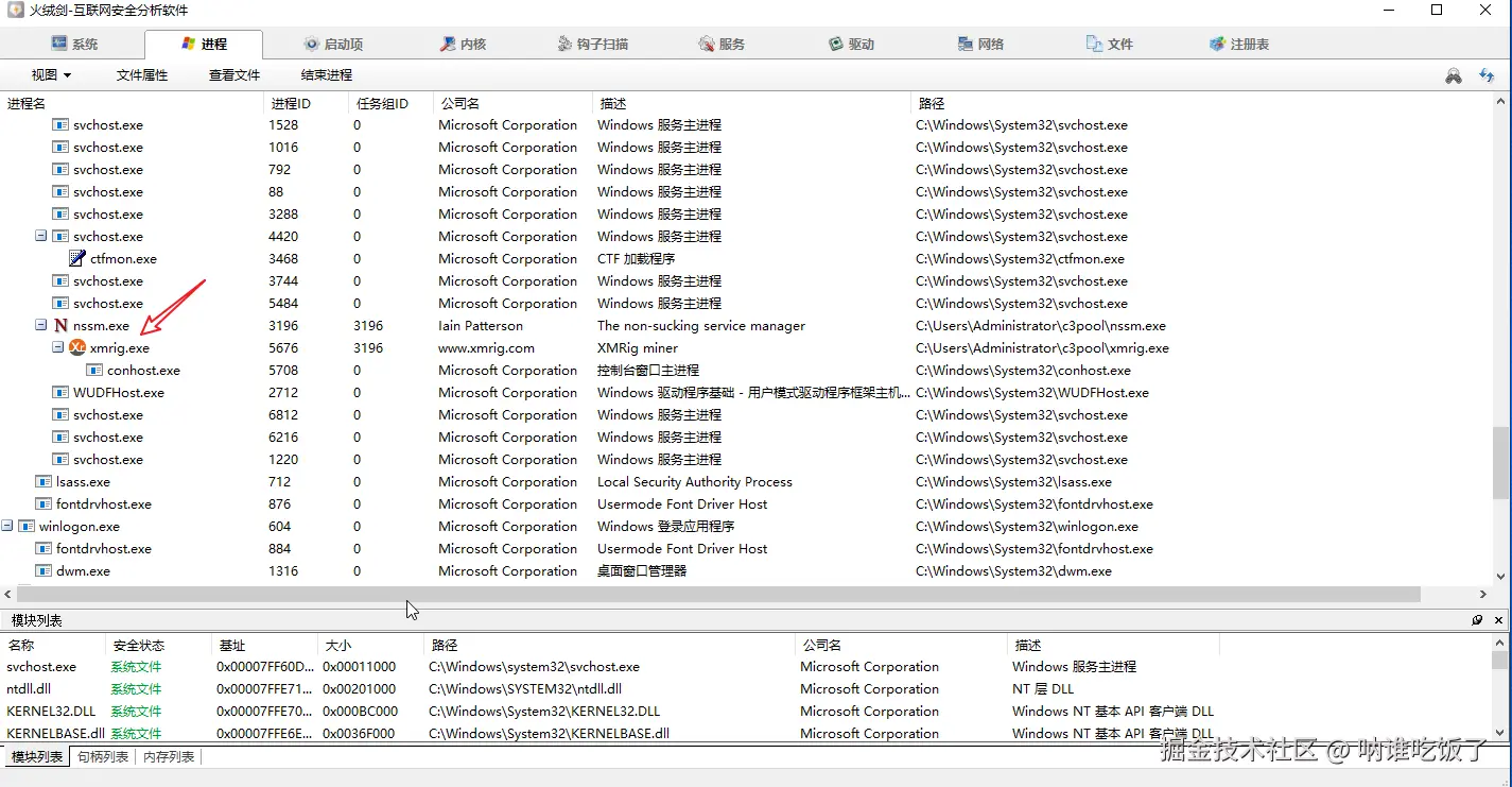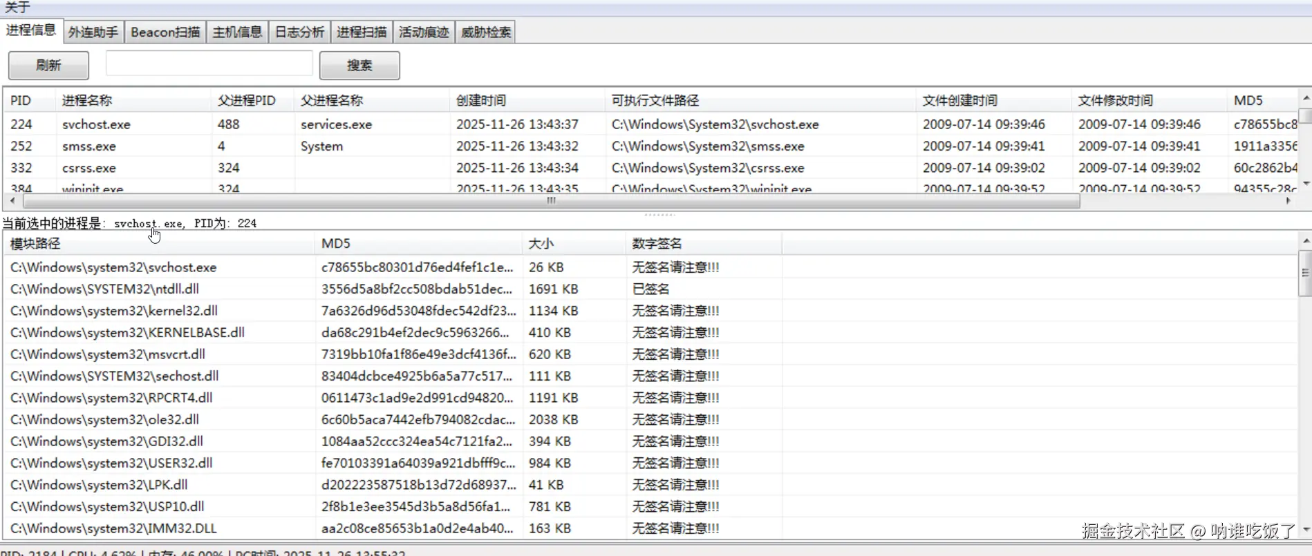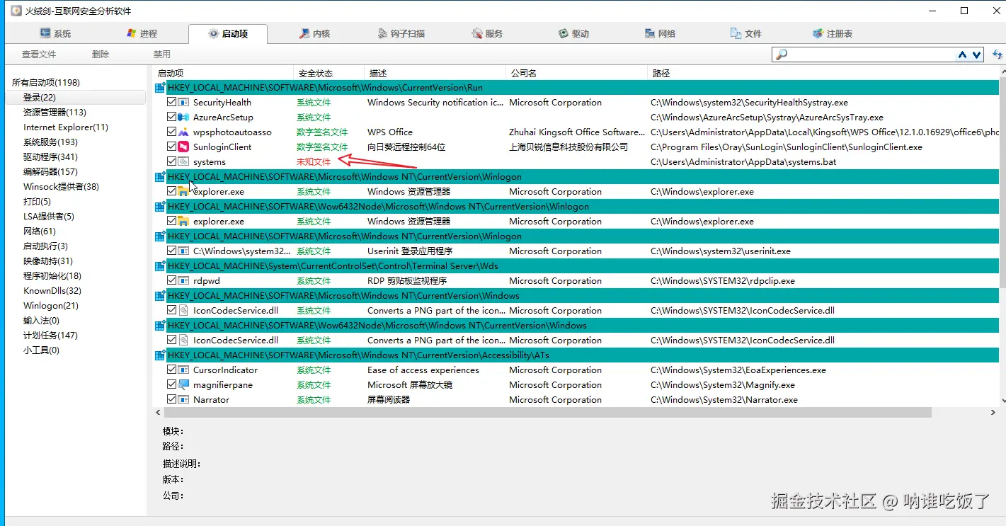 - 使用“msinfo32”查看进程,重点关注无签名信息、无描述、CPU或者内存占用高的进程。