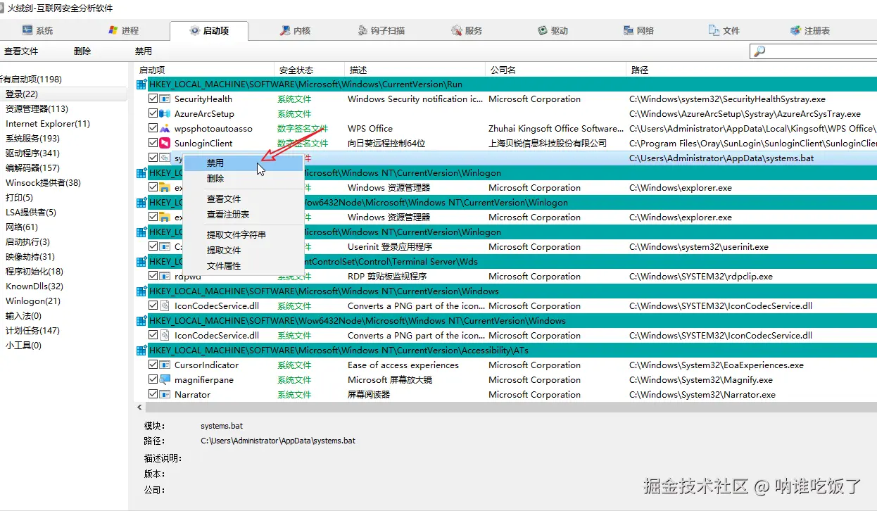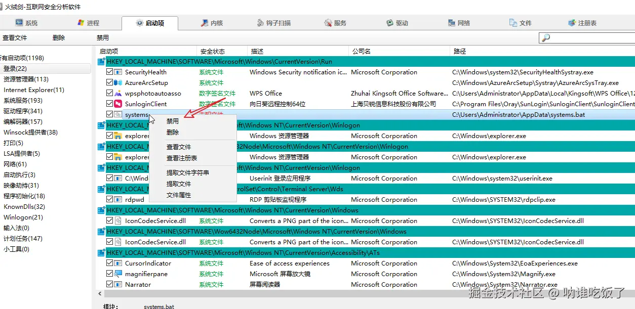 - 通过“msconfig”命令查看启动项,发现可以程序取消勾选,并删除文件。