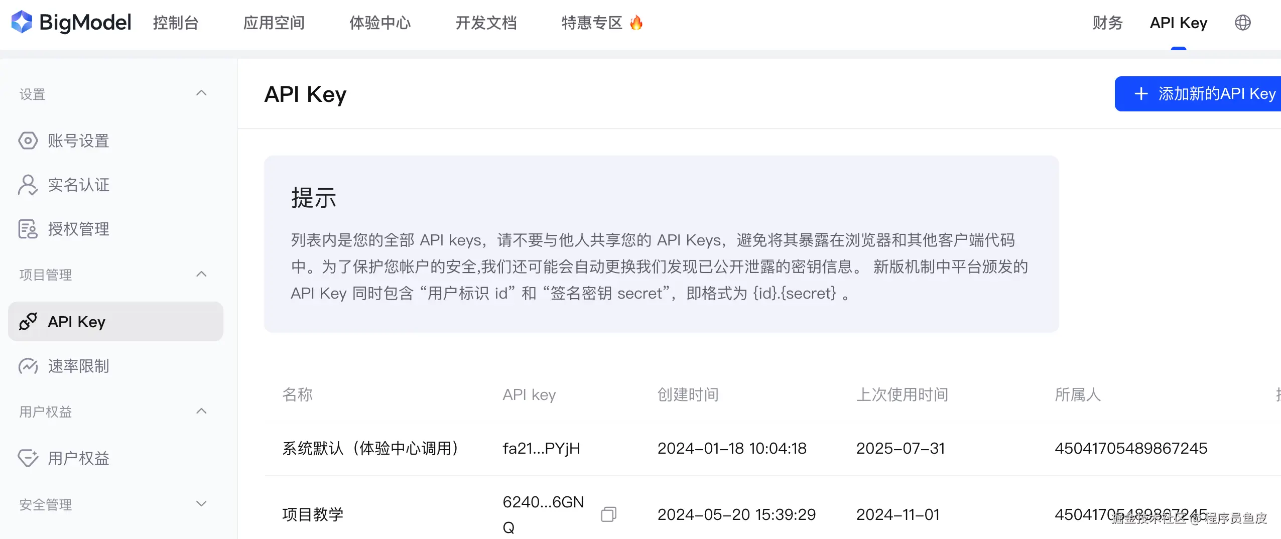 可以在智谱 AI 开放平台获取到 API Key,注意不要泄露!
