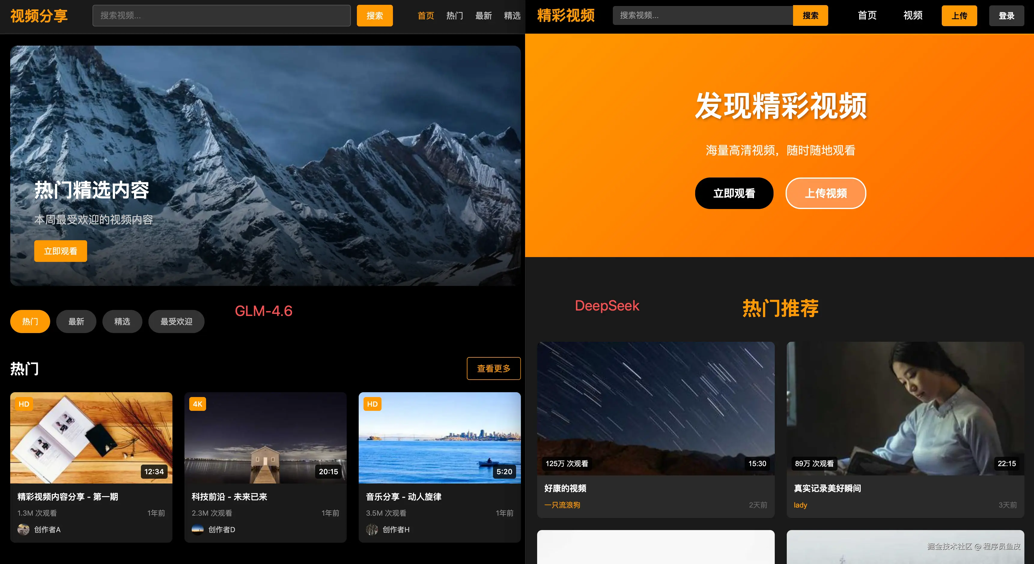 这把我觉得 GLM-4.6 的效果更好一些,增强了 “看视频” 的体验,有很多视频的分类;而 DeepSeek 考虑到了上传视频。到底哪个更符合现代视频网站的特点,我相信大家心里有答案。