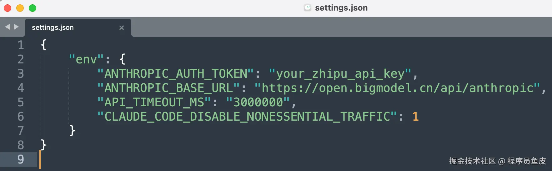 不过没关系,让我们把它背后的 AI 大模型换成国内的。首先进入 {用户目录}/.claude 目录,创建一个 settings.json 配置文件: