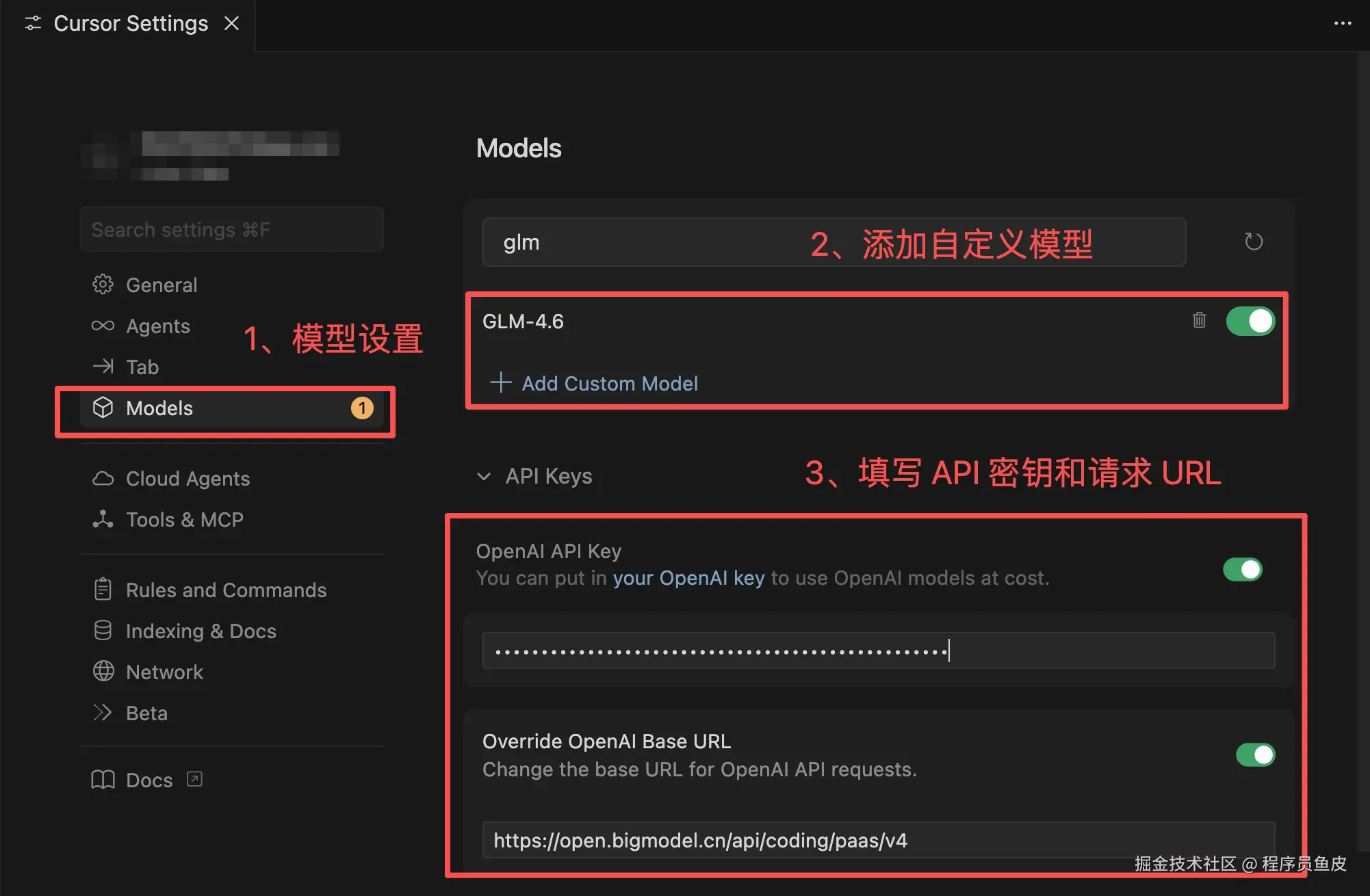 首先打开 Cursor 的设置界面,进入模型设置,然后添加自定义模型,注意名称一定要是大写的 GLM-4.6!