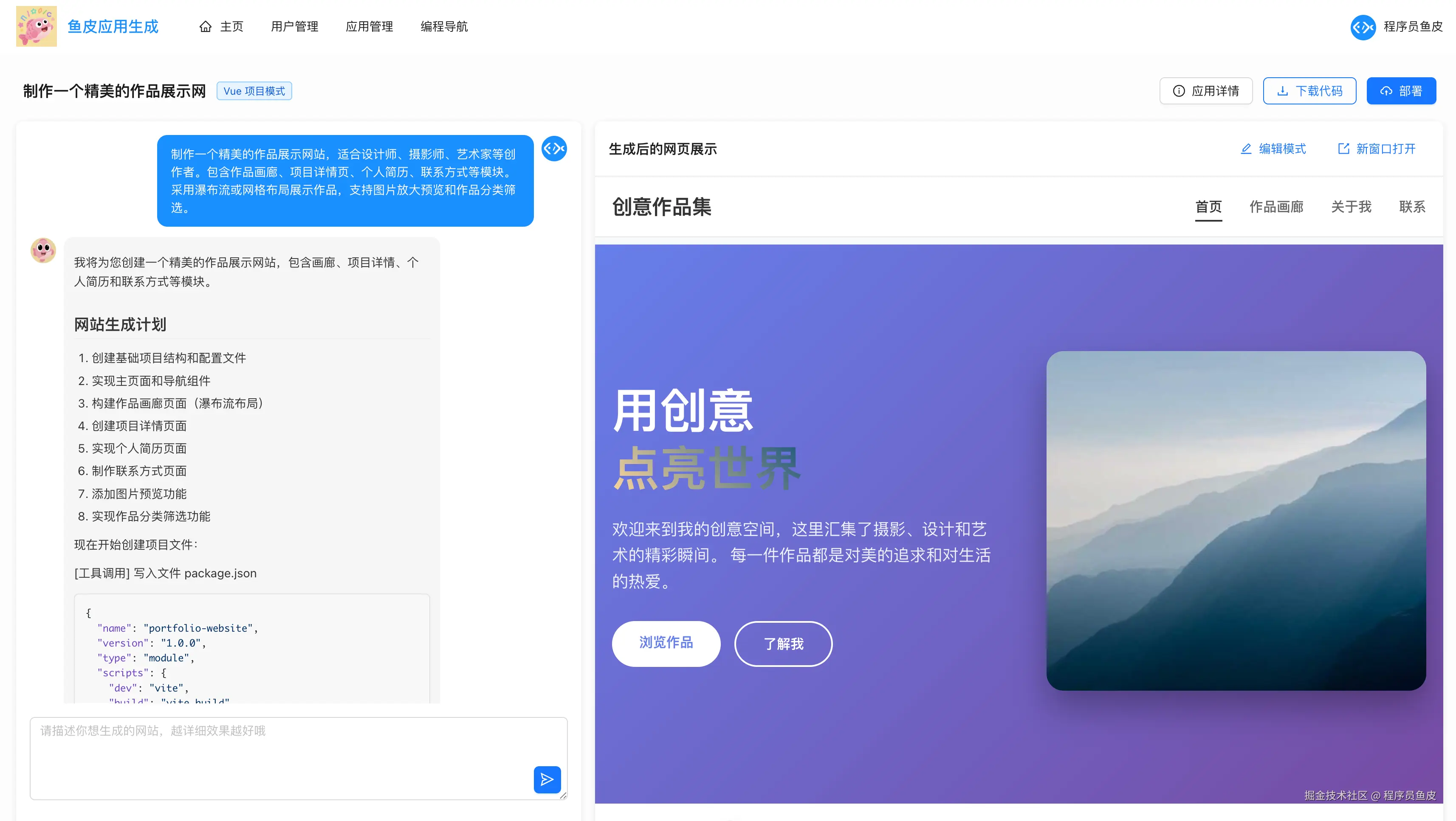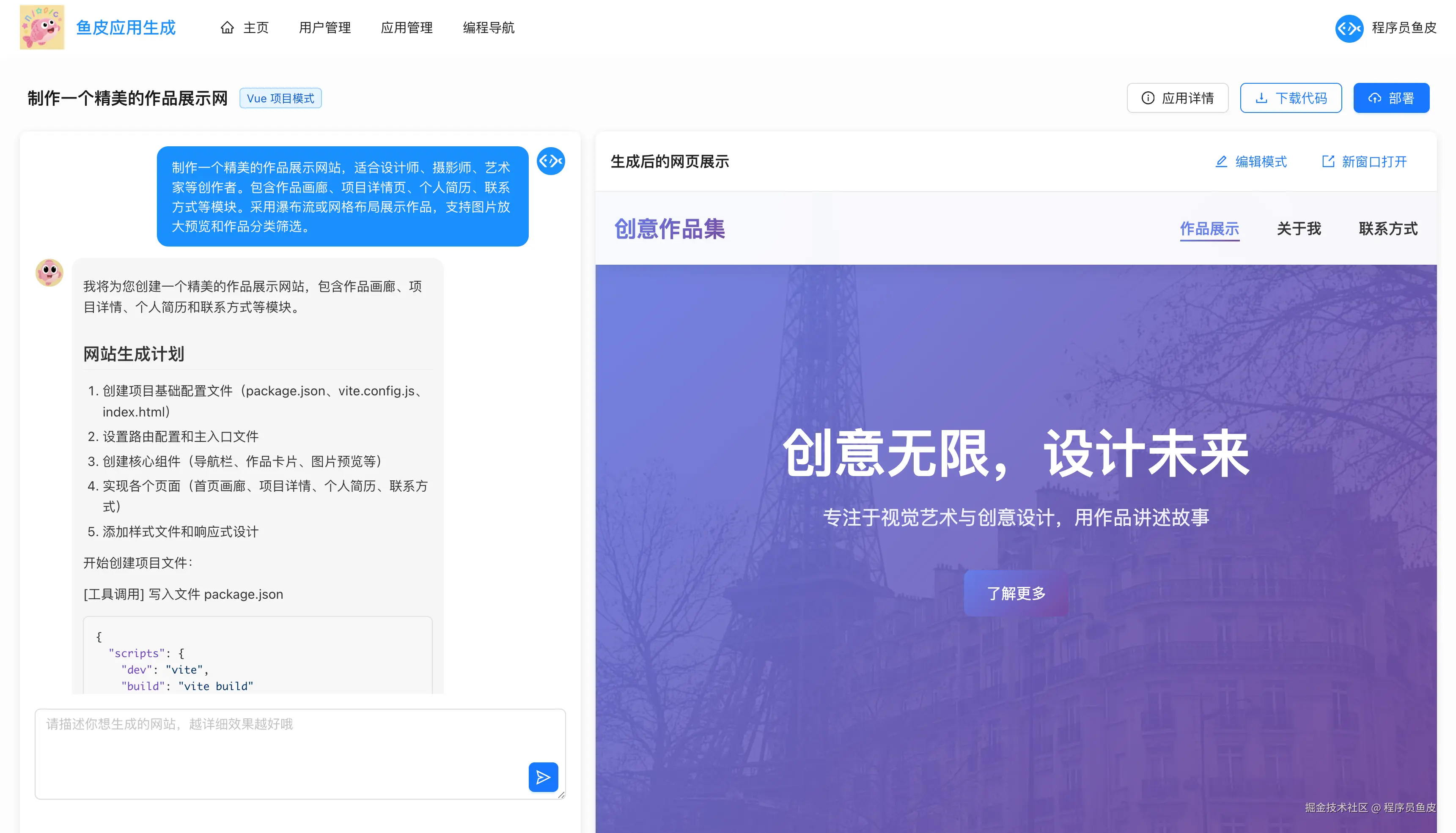 然后依次启动后端和前端项目,输入提示词,比如让 AI 制作一个精美的作品展示网站: