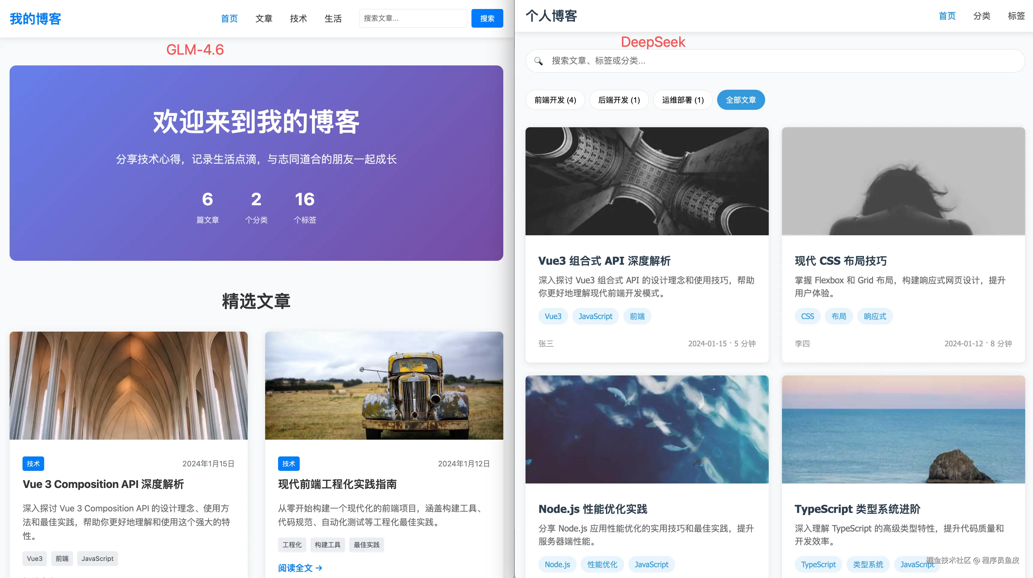 1)先是经典的个人博客网站,二者做出的效果差不多,GLM-4.6 更现代、DeepSeek 更简约传统: