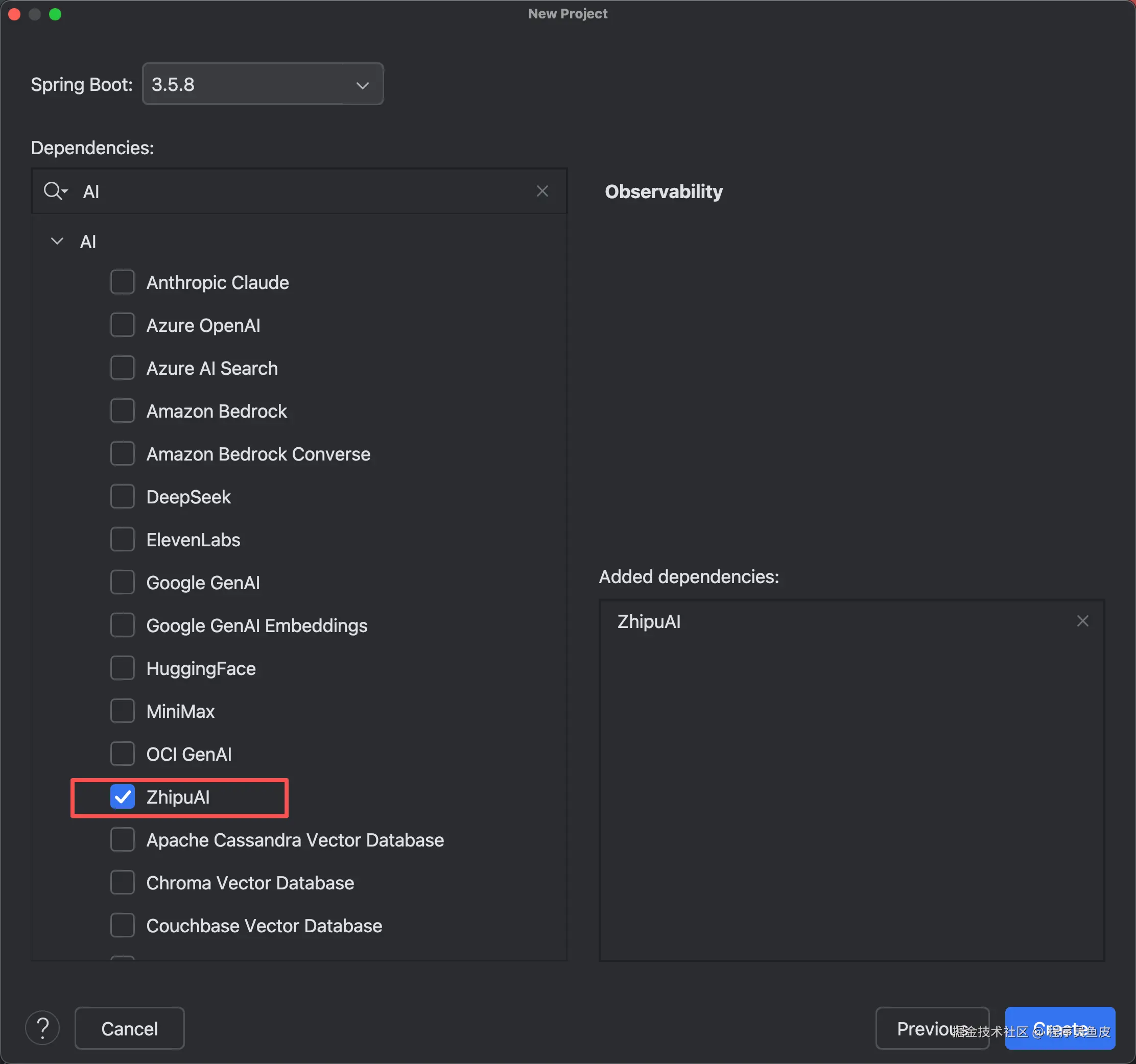 Spring AI 已经兼容了智谱系列的大模型(包括 GLM-4.6),只需要勾选 ZhipuAI 依赖就好: