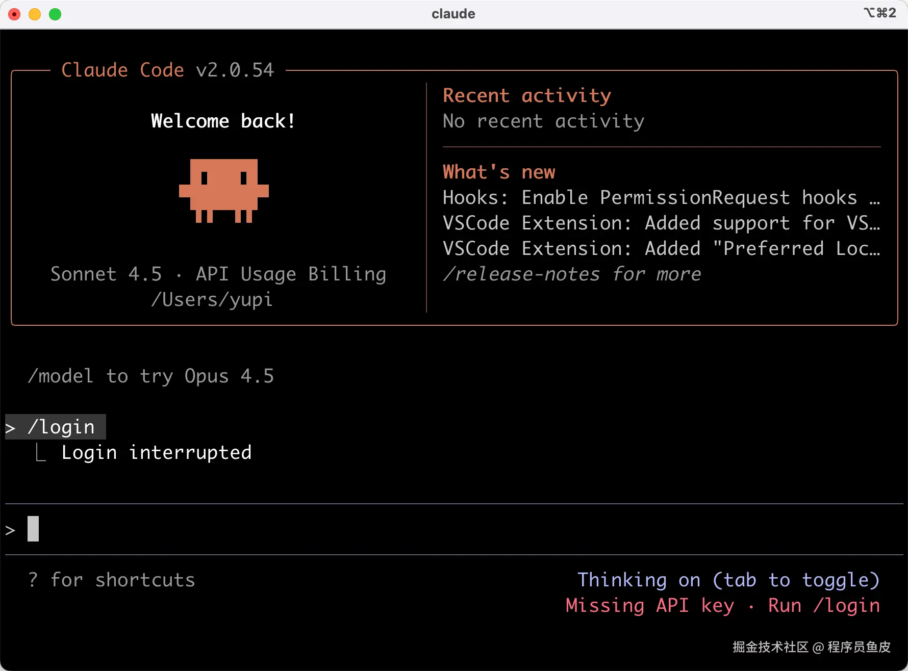 然后执行 claude 命令打开程序,默认是需要登录 Claude 账号的,否则无法使用:
