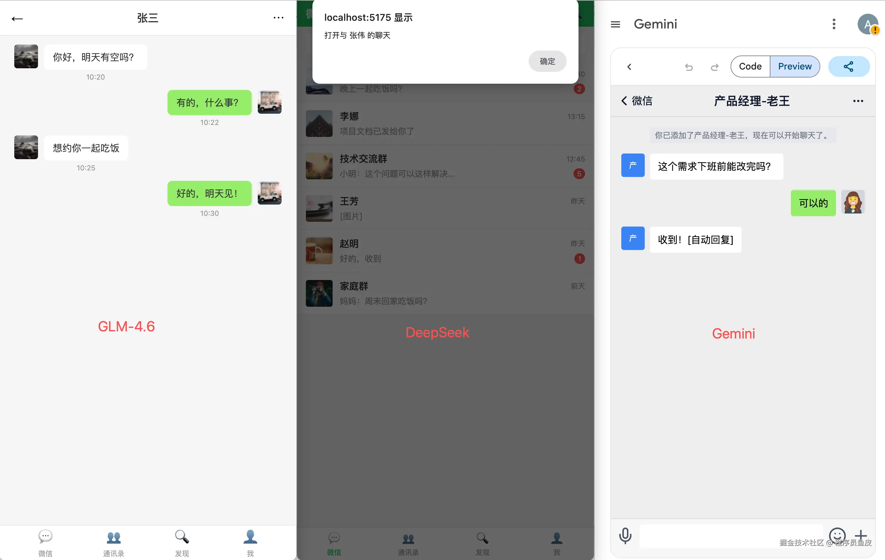 3)然后是做一个微信 UI 原型图,这次我要把 Gemini 3 拉进来一起对比。